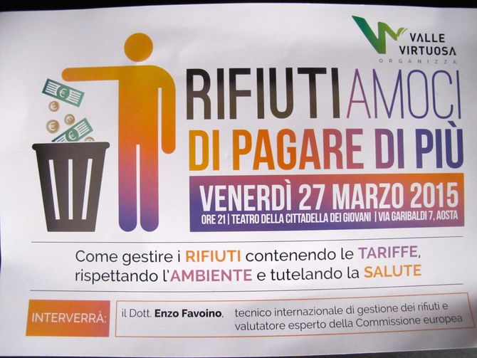 Secondo l’Assessorato regionale all’Ambiente sarà una mezza rivoluzione, per Valle Virtuosa una mezza fregatura. La riorganizzazione della raccolta differenziata dei rifiuti in Valle d’Aosta, in programma dal 1° giugno 2015, a cui seguirà in autunno il nuovo Piano rifiuti regionale, non convincono per nulla l’associazione. Tanto che i promotori del referendum contro il pirogassificatore hanno commissionato uno studio alternativo al Dott. Enzo Favoino, tecnico internazionale di gestione dei rifiuti e valutatore esperto della Commissione europea, che sarà presentato ai cittadini il prossimo venerdì 27 marzo 2015, alla Cittadella dei Giovani di Aosta, alle ore 21. Il titolo dell’incontro, “RIFIUTIamoci di pagare di più”, svela già che uno dei tempi affrontati sarà quello delle tariffe che secondo i dirigenti regionali aumenteranno, almeno nel breve periodo.