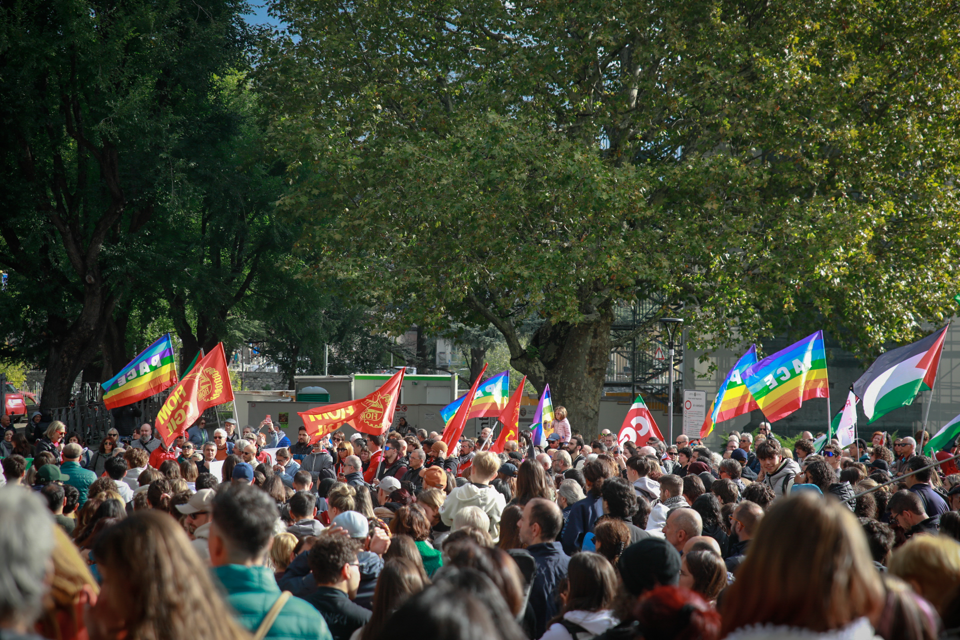 Numerose le bandiere della Palestina e della pace che hanno sventolato tutta la mattina, oltre a striscioni con slogan come “Stop al genocidio”, “Fate silenzio quando i bambini dormono, non quando muoiono” e “Flotilla di terra”, a sostegno della Global Sumud Flotilla. Più volte si è levato il grido “Free Palestine”, accompagnato da cori e applausi. Diversi gli interventi che hanno espresso critiche nei confronti del governo nazionale.