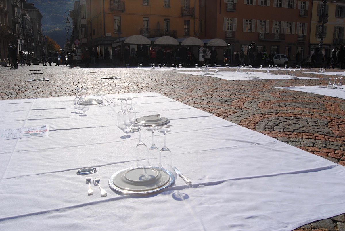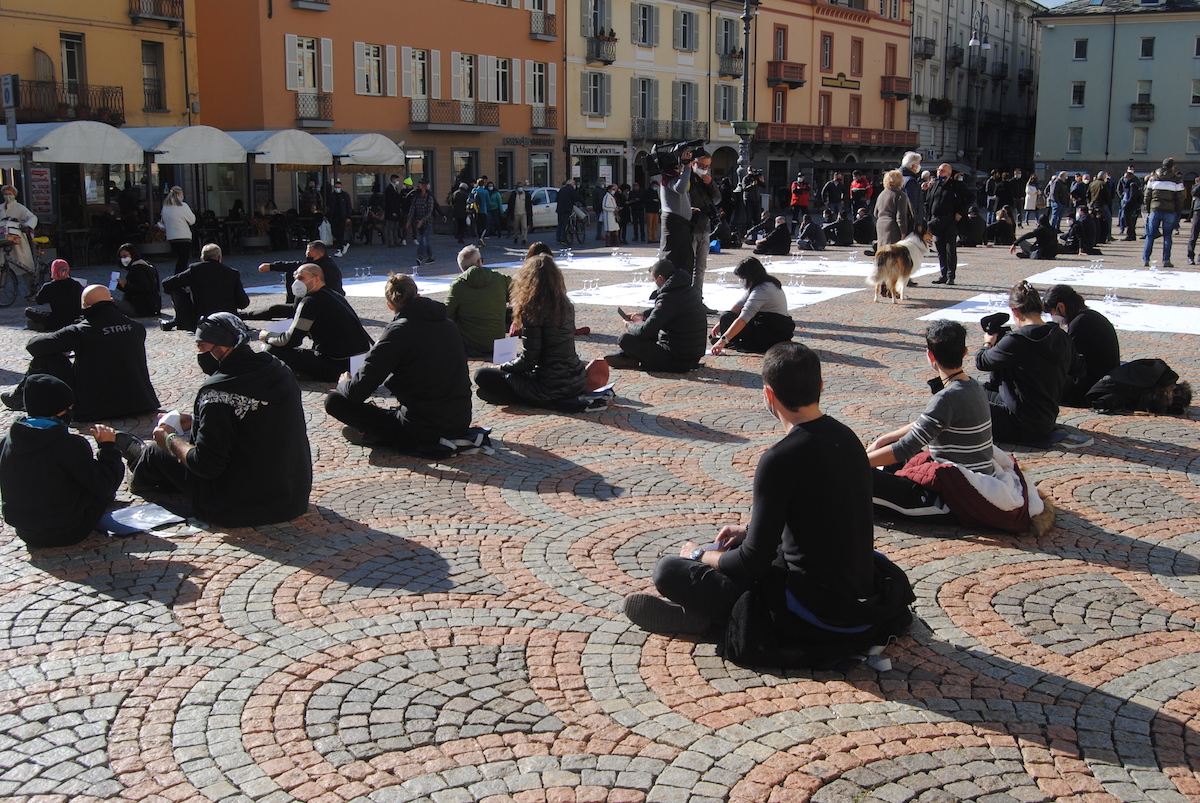 Prima “Il silenzio”, suonato con la tromba in piazza Chanoux, poi quello degli esercenti, seduti per terra nel “salotto buono” di Aosta.