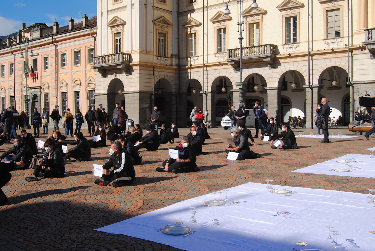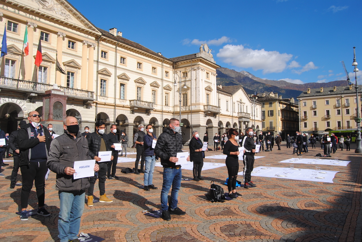 Al microfono il Presidente di Confcommercio Valle d’Aosta Graziano Dominidiato spiega: “Oggi siamo qui, siamo a terra, siamo qui come in altre 23 altre piazze italiane. Numerosi, coraggiosi, pacifici si, ma determinati, noi siamo quelli che ogni giorno si rimboccano le maniche. Ma di fronte a questa tragedia, purtroppo, non basta. ‘Siamo a terra’ economicamente. Il settore dei pubblici esercizi perderà quest’anno almeno 27 miliardi di euro su 96 di fatturato complessivo. 300mila posti di lavoro nel nostro settore rischiano di scomparire definitivamente. L’ulteriore imposizione della chiusura alle 18 ci costerà da sola 2,1 miliardi di euro, impedendo a 600mila persone di lavorare. Tutto questo oggi costa caro a noi, ma il conto lo pagherà tutto il Paese”.