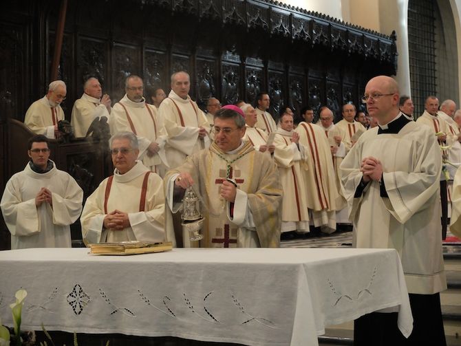 Triduo pasquale. Anche quest’anno il clero diocesano si è unito al Vescovo mons. Franco Lovignana nella consacrazione dei Sacri Oli che saranno distribuiti ai parroci per l’unzione dei fedeli.