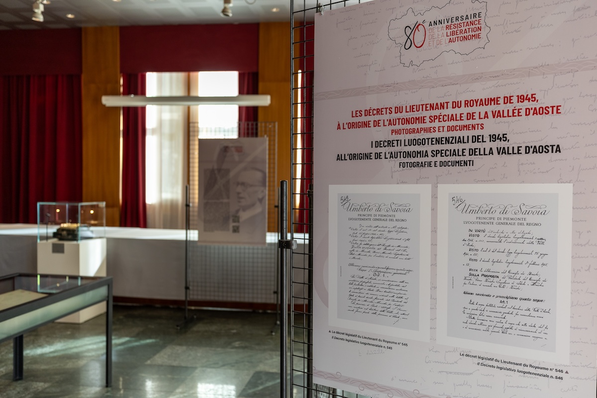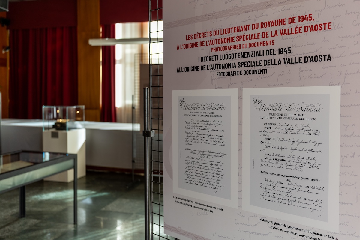 Dal 5 al 12 settembre, la saletta al piano terreno del Palazzo regionale, ad Aosta, ospiterà una mostra dal titolo Les décrets du Lieutenant du Royaume de 1945 à l’origine de l’autonomie spéciale de la Vallée d’Aoste.