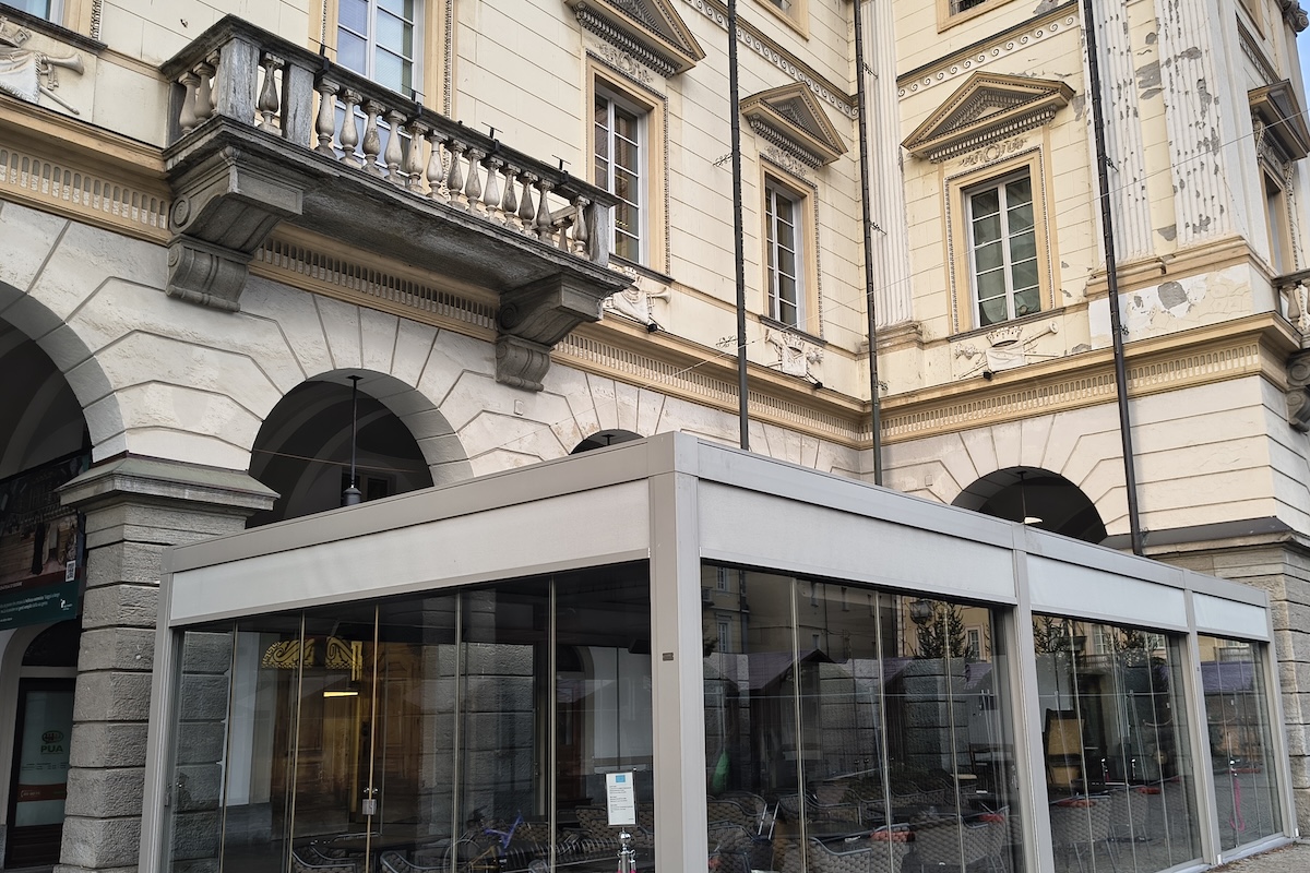 Un elemento del balconcino di piazza Chanoux si stacca e finisce sul tetto del dehors del Caffè Nazionale