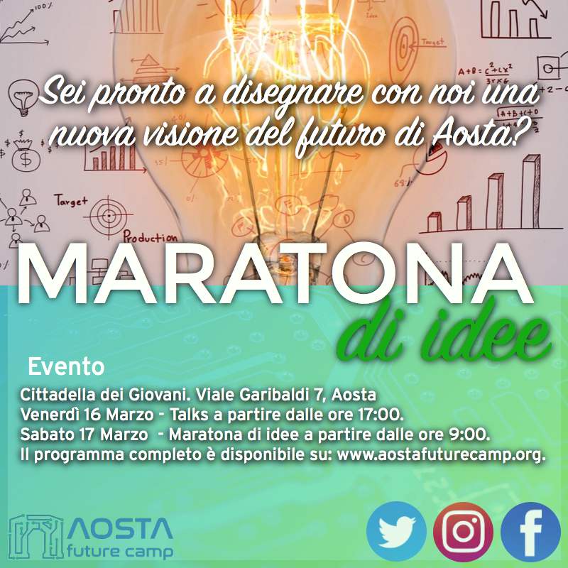 Il giorno seguente, sabato 17 marzo, dalle ore 9, con l’impostazione di un vero e proprio Hackathon, avrà luogo la maratona di idee aperta a tutti “Aosta Città Connessa”: 10 ore consecutive in cui squadre eterogenee di non più di 6 persone si sfideranno su idee e progetti finalizzati alla costruzione dell’Aosta del futuro sullo sfondo di 5 aree tematiche a scelta: Ambiente, Arti e Trasformazione, Educazione e Integrazione, Impreditorialità, Turismo.