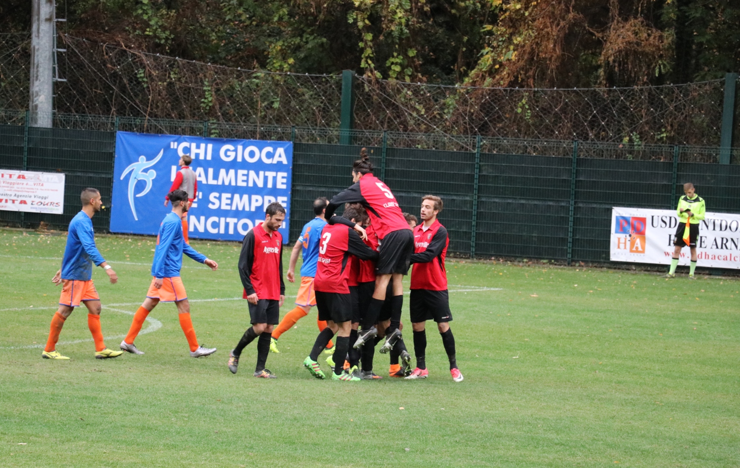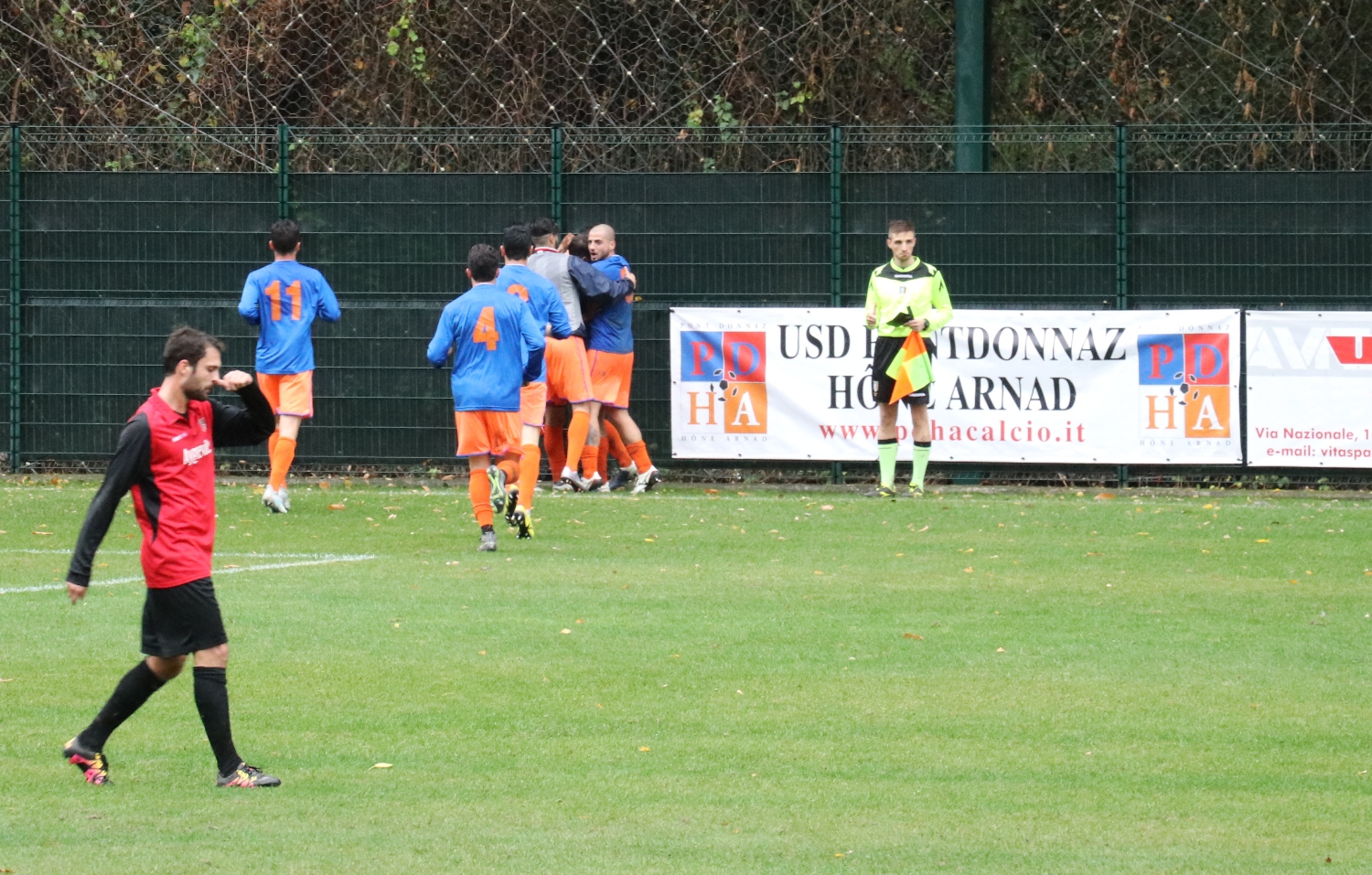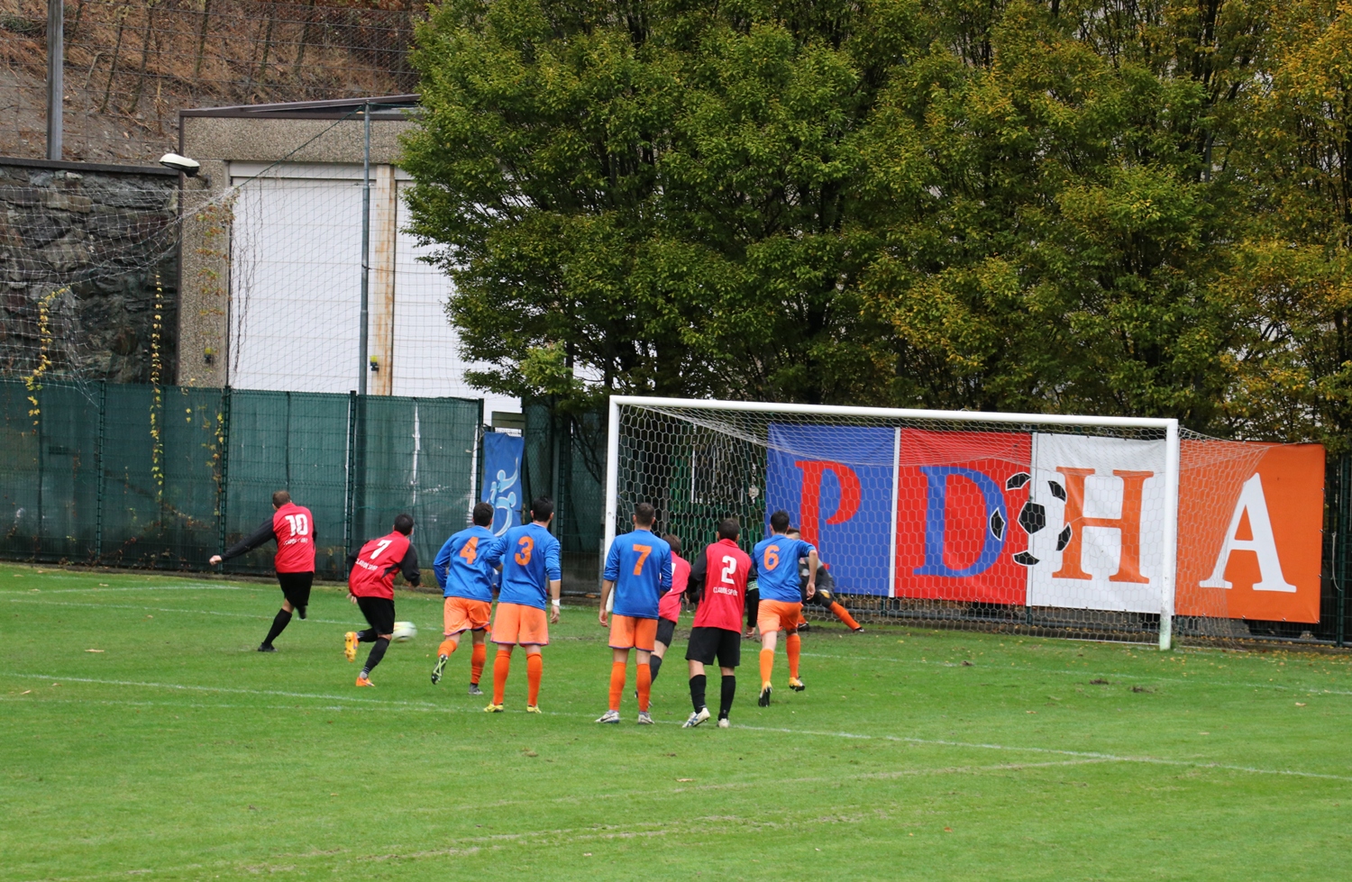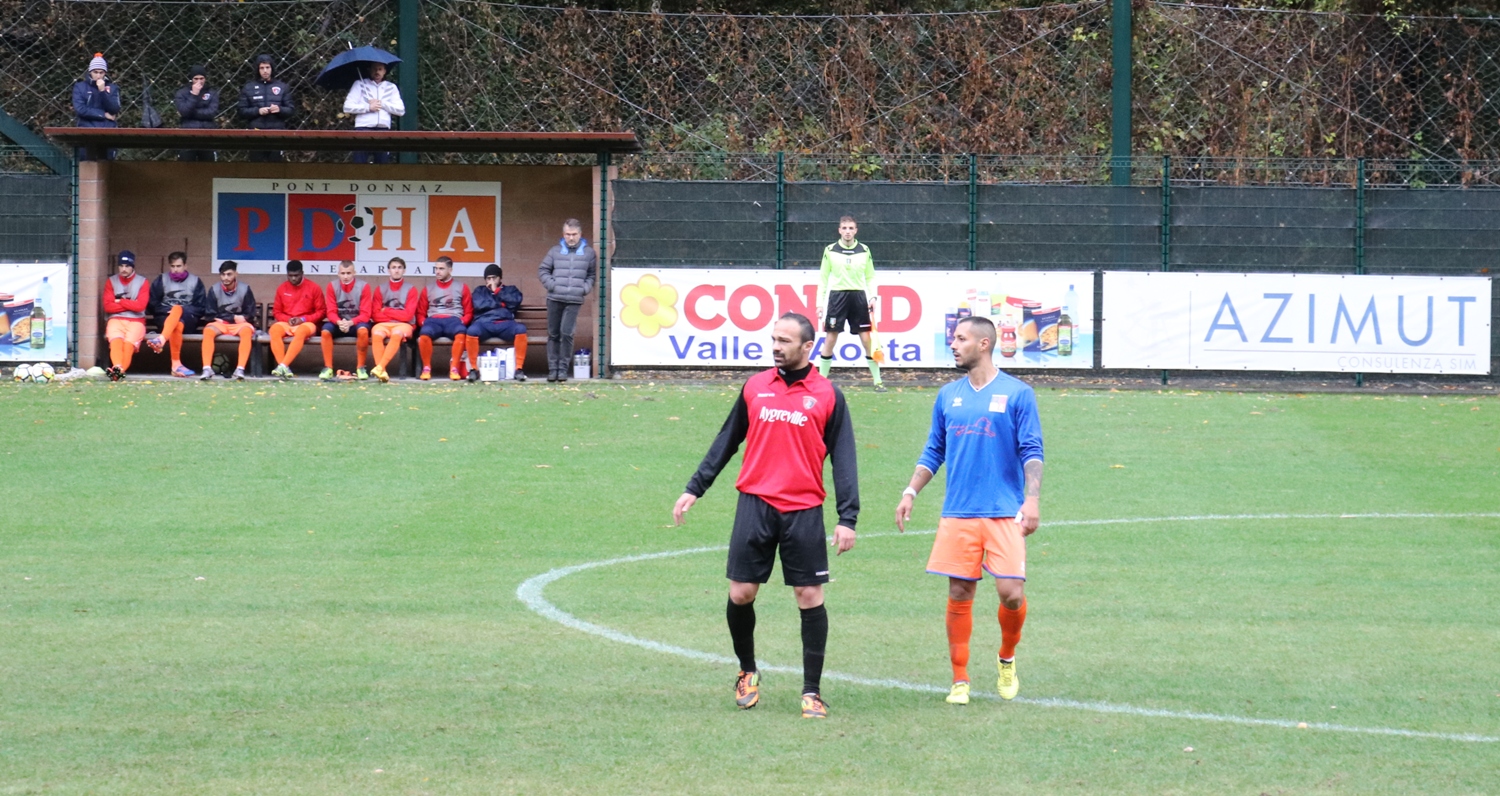 Su un campo reso pesante dalla pioggia, i padroni di casa arrivano reduci da una serie di buone prestazioni e risultati mentre i rossoneri, con uno stato d’animo opposto, mancano all’appuntamento coi tre punti da ormai 5 giornate, condite da prestazioni opache sia dal punto di vista del gioco che della personalità. Sotto questo profilo la squadra di Rizzo sembra recuperata, ed in avvio ha più piglio rispetto agli orange. Ci vogliono solo 6 minuti per sbloccare l’incontro. Prima Jeantet non arriva di poco su un cross di Bettini dalla sinistra. Sulla ripartenza la palla arriva a Turato che ha campo davanti a sé e arriva incontrastato fino al limite dell’area di rigore, da cui lascia partire una conclusione di sinistro che si infila alla destra di Lupu. Due minuti dopo si fa vedere ancora l’Aygreville, ma Mazzocchi riesce solo a sfiorare di testa il cross di Cunéaz. La reazione del PDHA è affidata ai piedi di Amato, ma la sua punizione da buona posizione finisce comodamente tra le braccia di Gini. I ragazzi di Brando riprendono a macinare gioco alla ricerca del pareggio, ma è ancora Turato ad andare vicino al gol con una conclusione al volo calciata alta. L’1-1 arriva dal sinistro di Jeantet, che è bravo a sfruttare una corta respinta di testa di Monetta (ex della partita insieme a Prola) ed a trafiggere Gini. Il PDHA continua ad avere il pallino del gioco ed a creare molto, ma come spesso è accaduto in questa stagione mancano le soluzioni una volta arrivati ai 20 metri, tant’è che le conclusioni in porta sono state pochissime, da una parte e dall’altra. Dal canto suo l’Aygreville gioca una partita di grinta e denti stretti, affidandosi alle interdizioni e ripartenze. Va sottolineato come nessuna delle due squadre si risparmi, né sugli interventi né sul ritmo, non lasciando mai un attimo di respiro ai tanti spettatori. Sugli sviluppi di un cross Pramotton viene affossato e l’arbitro fischia un calcio di rigore, che Baldi realizza spiazzando Lupu. È il 39’ e l’Aygreville va al riposo avanti 2-1.