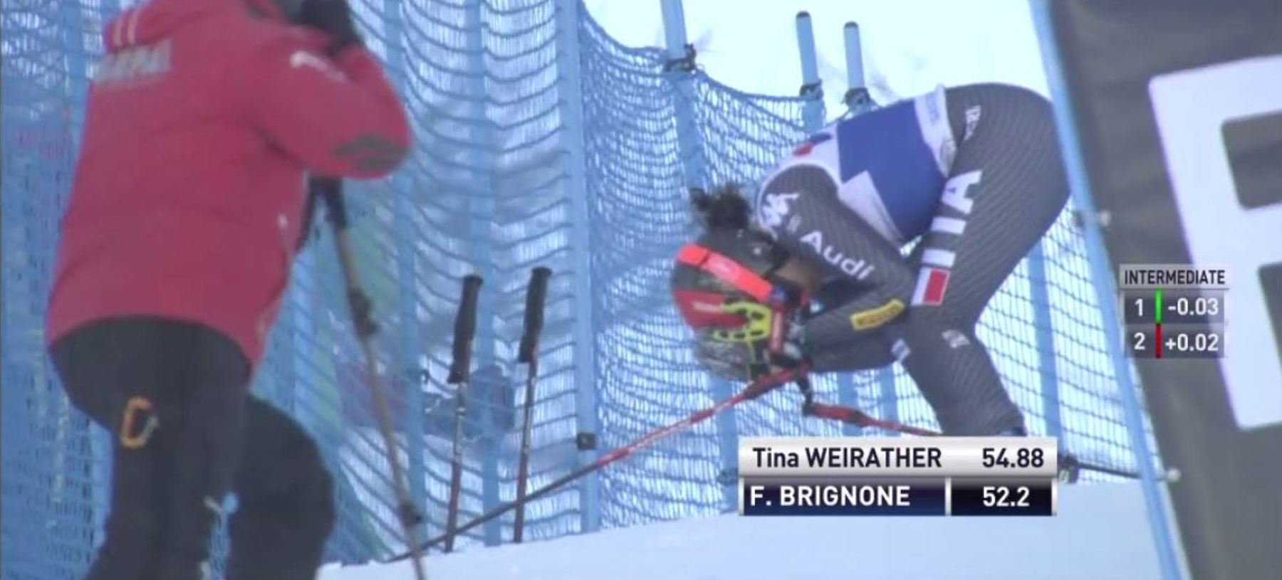 Consapevole di non aver sciato all’altezza delle aspettative sue e di tutti, alla vigilia l’atleta di La Salle aveva detto: “Ho sistemato alcune cose, vediamo se saprò essere performante fin da subito. In allenamento non andavo così male, ma in gara non sono mai riuscita a tirare fuori quello che dovevo e volevo, soprattutto nelle seconde manche”. Oggi, partita con il pettorale numero 4, dopo un primo intertempo in cui era prima ed un secondo in cui si ritrovava a soli tre millesimi dalla momentanea leader Tina Weirather (che ha poi chiuso la prima manche in seconda posizione, a un millesimo da Mikaela Shiffrin), si è inclinata troppo con le spalle e, sbilanciata, ha perso aderenza con lo sci. Brignone è apparsa disperata, al centro di un periodo nero che non vuole accennare a finire. Al termine della gara, Federica Brignone ha comunque tenuto a ringraziare il suo fan club ed il pubblico piemontese per il sostegno.