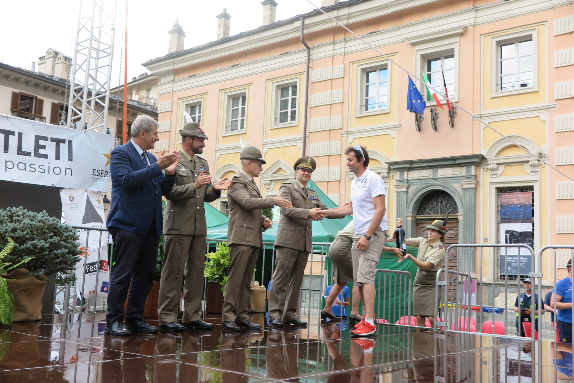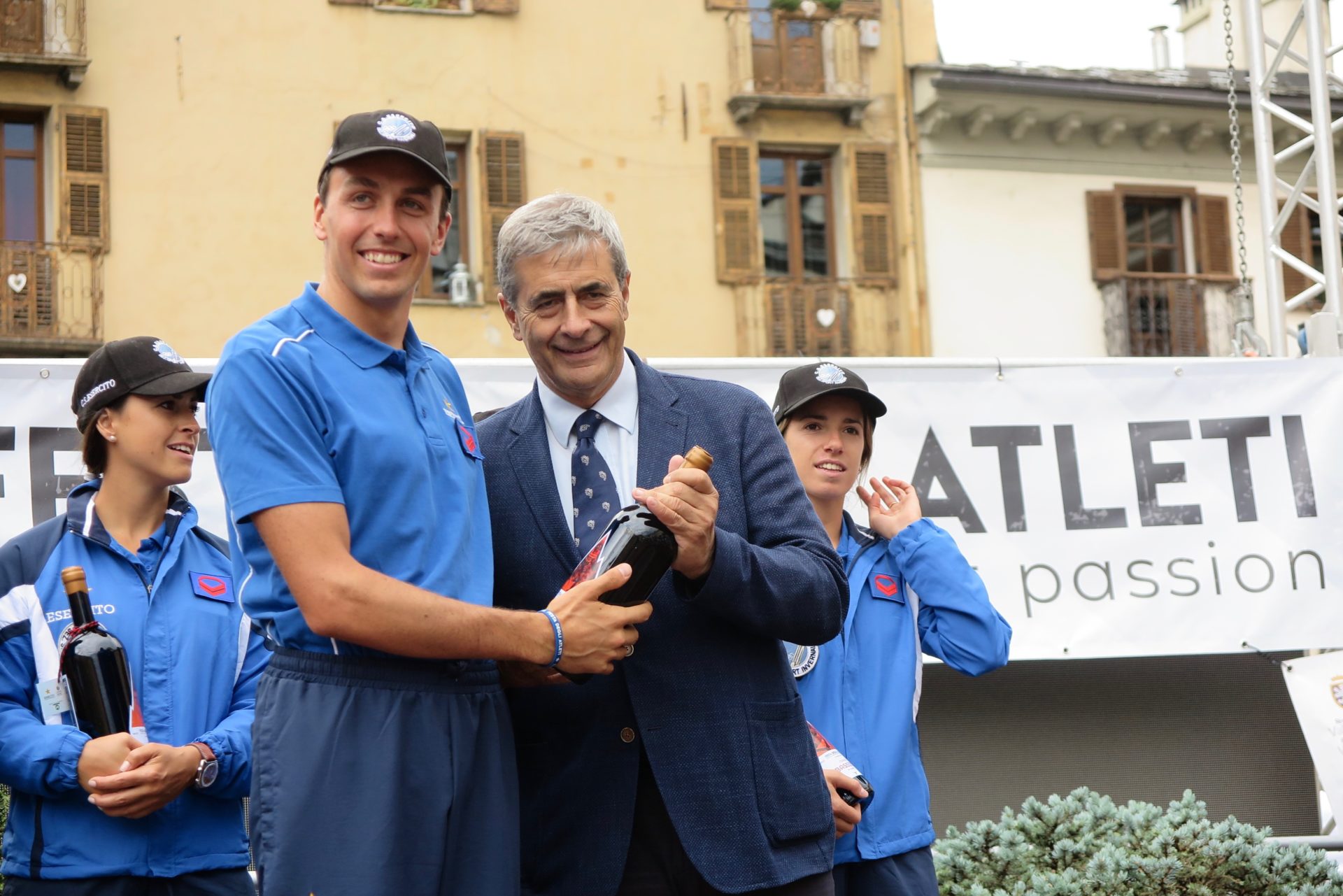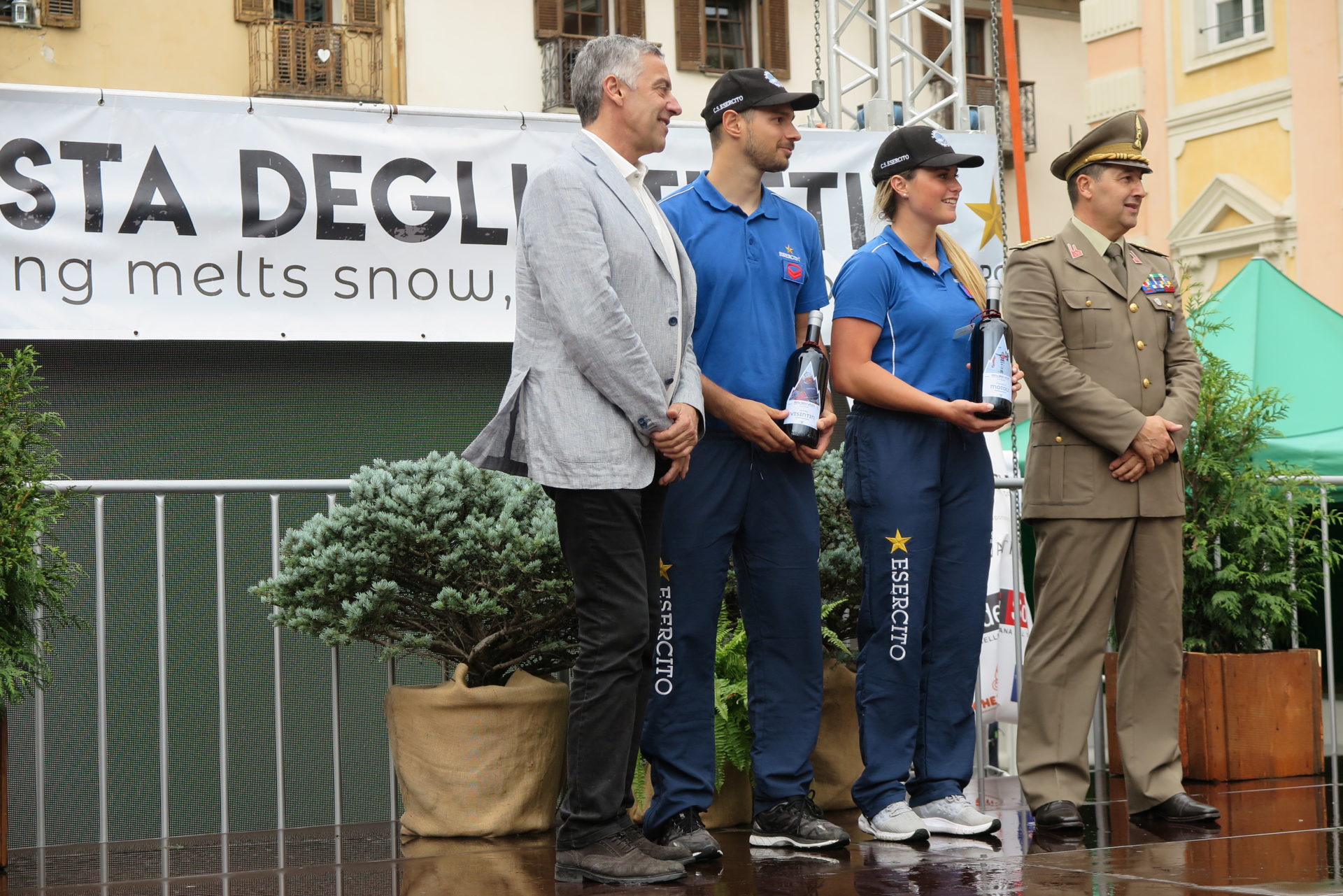 Salgono sul palco, presentati dallo speaker sportivo Silvano Gadin costretto per un attimo a sospendere la diretta a causa della grandine, campioni e autorità.