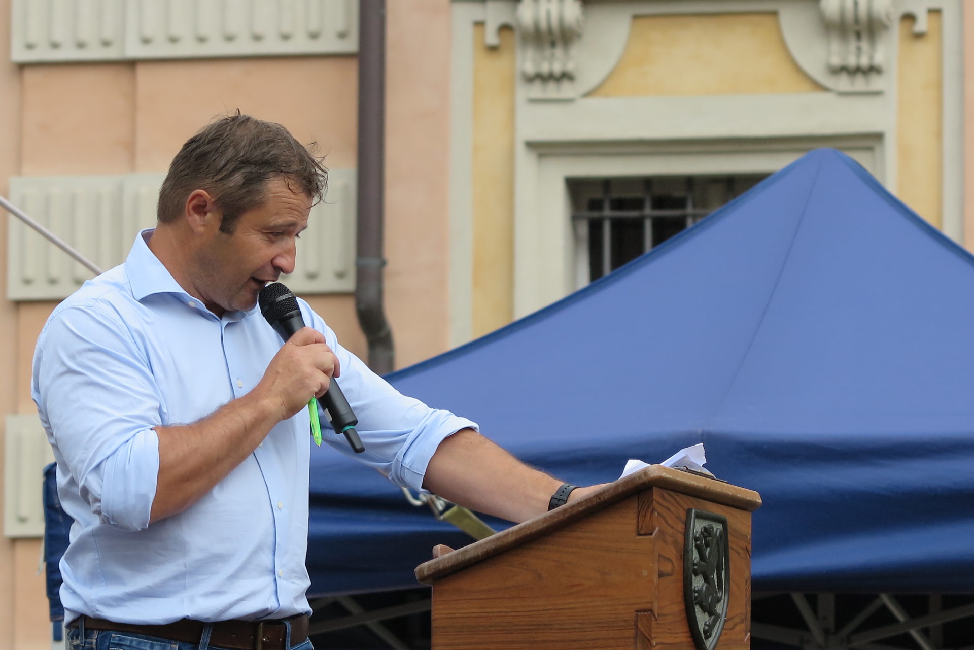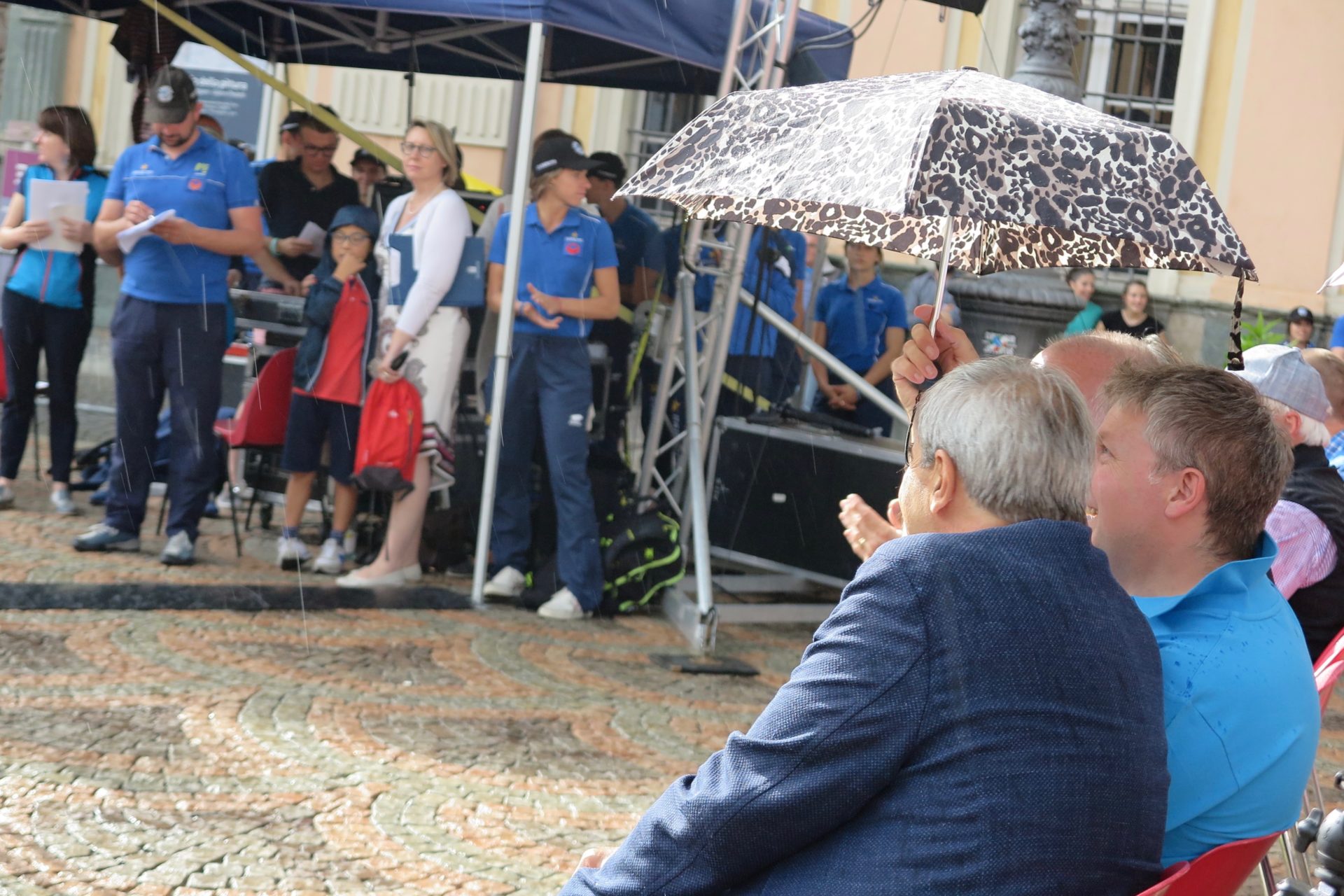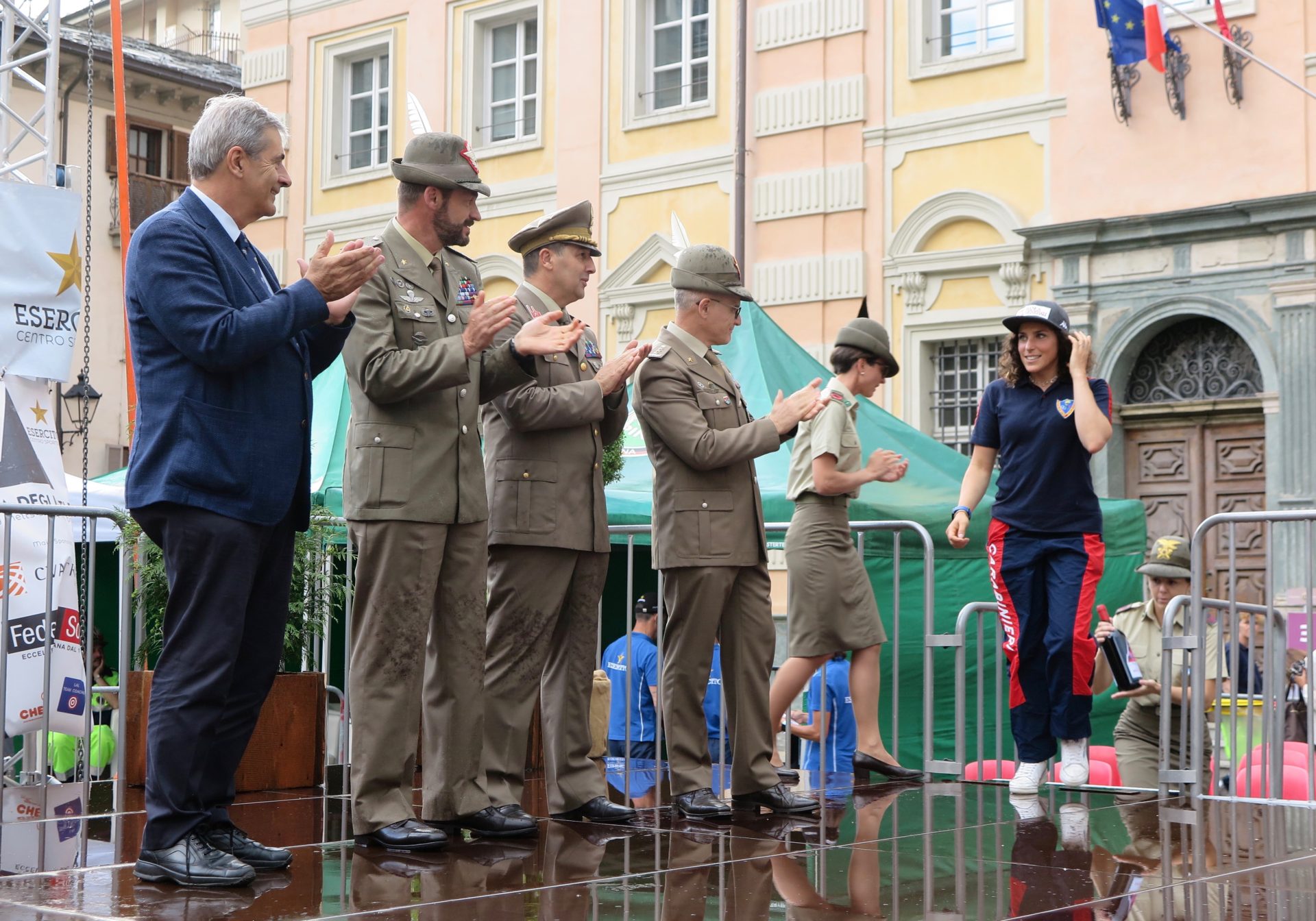 Salgono sul palco, presentati dallo speaker sportivo Silvano Gadin costretto per un attimo a sospendere la diretta a causa della grandine, campioni e autorità.