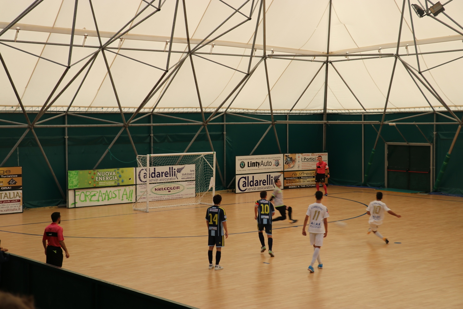 La squadra di Rosa ha finalmente dato mostra di una buona prova portata avanti fino all’ultimo, dominando totalmente un Lecco quasi nullo. Ci vuole più di metà tempo perché il risultato si sblocchi. Nel mentre, Calli si fa vedere in un paio di occasioni, il neocapitano Estedadishad arriva scoordinato su due conclusioni ed il Lecco colpisce un palo. Poi, all’11’10”, sale in cattedra Pellegrino che, dopo aver preso la palla, si costruisce da solo il gol, saltando due avversari e concludendo in diagonale. Due minuti dopo, Iurmanò colpisce il palo, ed al 15’ il portiere avversario anticipa di un soffio Rosa, ben imbeccato da Calli su un’azione del solito Pellegrino. Ed è proprio lui a guadagnarsi l’ennesimo fallo al 16’, trasformando il conseguente tiro libero. Due brividi scorrono lungo la schiena degli aostani, prima al 18’, per una punizione a 2 dal limite dell’area, e poi sulla sirena, quando Siqueira allunga la mano ed impedisce al portiere avversario di trovare la via del gol. Si chiude un primo tempo con un’Aosta da applausi, ben schierata che ha la sola pecca di dare modo agli avversari di aggredirla, mentre il Lecco è prevedibile e, nonostante il portiere di movimento – che fa l’uomo più avanzato, limitandosi solamente a fare da sponda – crea ben poco.