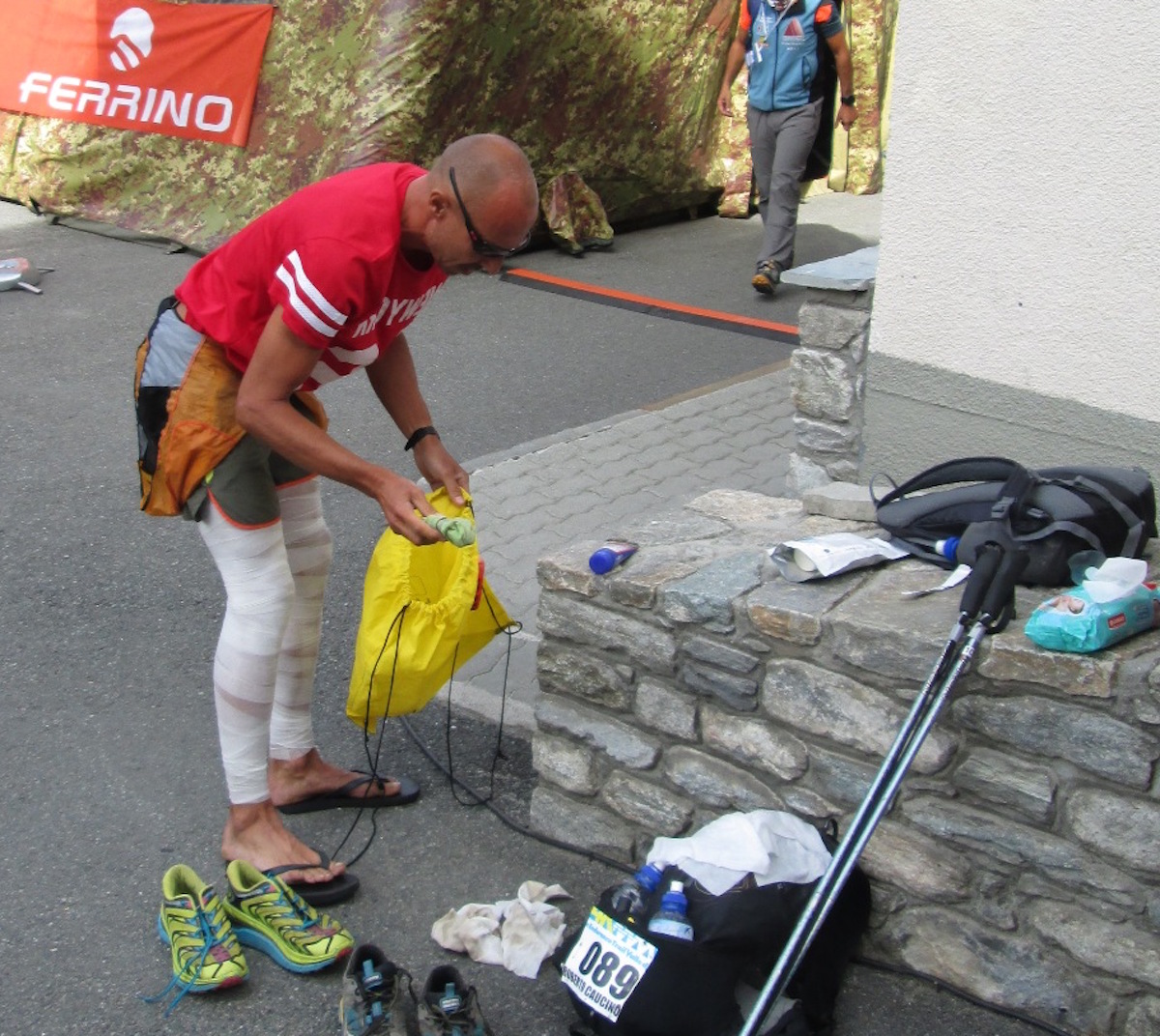 “Non sapevo quale delle due gare si sarebbe disputata, perciò mi sono iscritto ad entrambe. Sono stato chiamato ad entrambe, perciò le correrò entrambe”. Ha le gambe fasciate per recuperare dalle fatiche delle prime ventiquattro ore e il suo volto esprime qualcosa che sta a metà tra lo sforzo ed un sorriso. Roberto Caucino, quarantasettenne di Biella, arriva alla base vita di Courmayeur in ventinovesima posizione. Quest’anno ha già al suo attivo alcuni trail, tra cui i 107 chilometri de La Montagn'Hard ed i 170 dell’Andorra Ultra Trail. Nulla in confronto a quello che l’aspetta nelle prossime due settimane: i due ultra-trail valdostani, per un totale di 680 km di lunghezza e quasi 50000 metri di dislivello positivo.