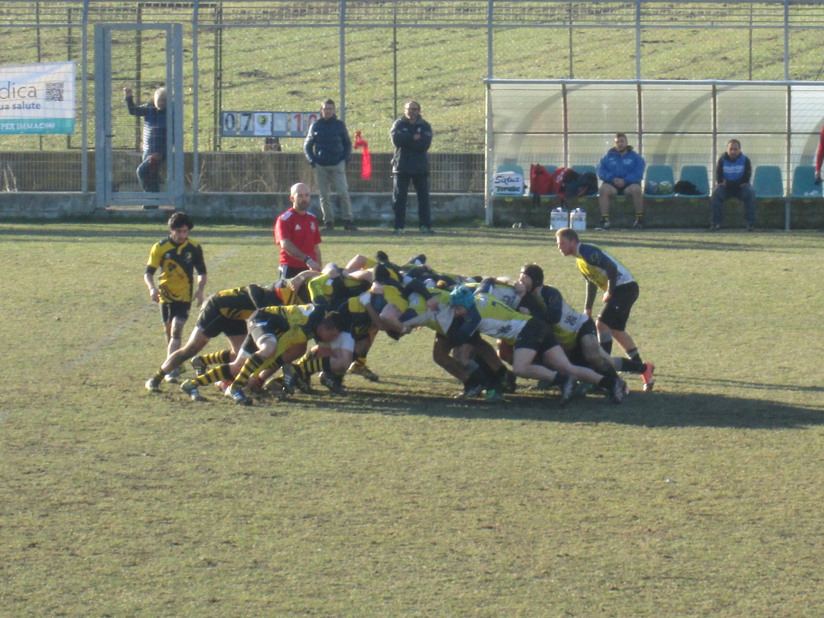 La squadra di casa è falcidiata dagli infortuni ed è addirittura costretta a schierare in panchina il presidente Francesco Fida. Una stagione difficile che, alla lunga, si sta facendo sentire, ma i leoni non vogliono saperne di cedere. L’avvio dell’incontro è positivo, e dopo pochi minuti i padroni di casa vanno in meta con Rossi, già autore di due marcature la scorsa settimana. Anselmet trasforma e lo Stade è avanti 7-0. Passano solo due minuti e il San Mauro trova la meta, ma il palo impedisce la trasformazione ed i gialloneri restano avanti. Attorno al 10’ uno scivolone difensivo spiana la strada alla seconda meta ospite per il momentaneo 7-10. Lo Stade fa fatica a creare gioco e a guadagnare metri e si carica di troppi falli ed imprecisioni, ma può contare su una fisicità superiore: alla mezz’ora la mischia guadagna parecchi metri e costringe il San Mauro ad un fallo con relativa espulsione temporanea. Il piazzato di Anselmet vale il pareggio 10-10, che non cambierà fino alla fine del primo tempo. Coach Gleyze non è contento e lo si sente cercare di dare la carica ai suoi nella pausa tra le due frazioni di gara. Nella ripresa, nessuna delle due squadre riesce a costruire gioco e la partita risulta brutta. Da una parte e dall’altra sale un po’ il timore di commettere errori decisivi, visto che la vittoria dello Stade sancirebbe l’addio alle speranze di passaggio del turno per il San Mauro, mentre la vittoria degli ospiti li porterebbe pericolosamente a ridosso dei gialloneri in classifica. Al 12’ brivido per lo Stade, che riesce ad evitare la meta con un buon salvataggio difensivo in extremis. Al 26’ i padroni di casa vanno in inferiorità numerica e pagano la situazione a carissimo prezzo quando, al 32’, il San Mauro realizza la meta del definitivo 10-17.