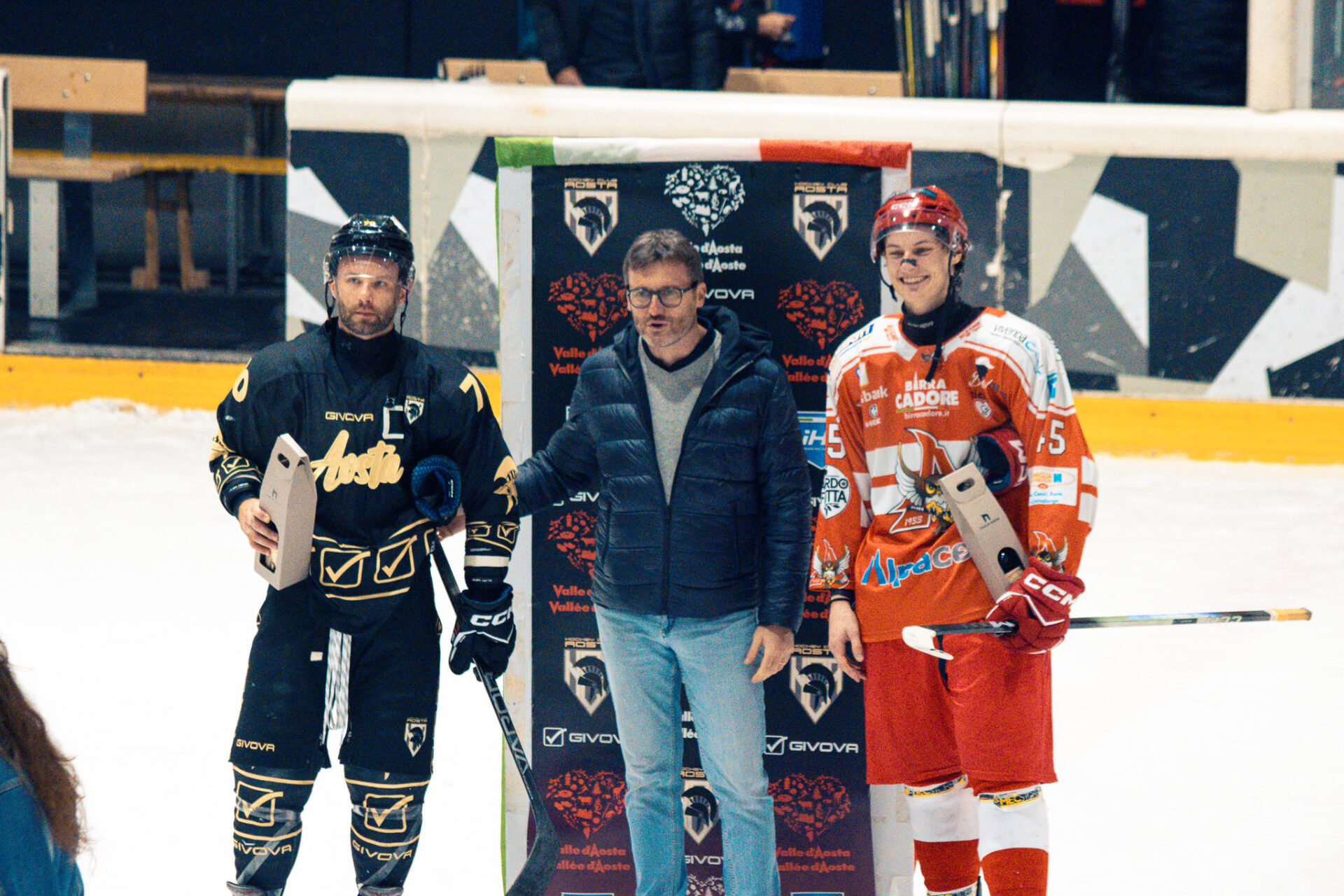 A fine gara, però sono stati premiati MVP dell’incontro Edgar De Toni per l’Alleghe, autore di due goal, e Dmytro Nimenko per l’Aosta, riconosciuto per l’impegno in un momento difficile per la squadra.