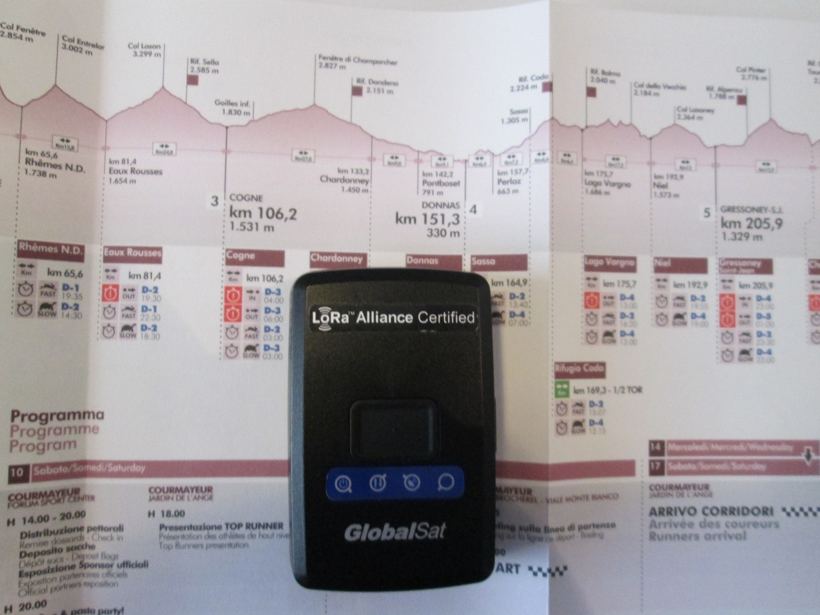 Cinque centimetri di altezza, tre di lunghezza e uno di profondità, per un peso totale di appena 100 grammi: sono queste le dimensioni del dispositivo GPS in dotazione ad alcuni corridori del Tor des Géants, che avrebbe dovuto consentire a tifosi e famigliari di seguire da casa in tempo reale le gesta e la localizzazione dei propri beniamini.