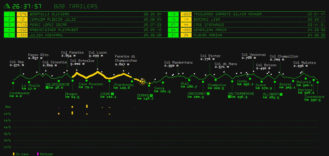 “Potranno farlo anche loro”, spiega Paolo Griselli, responsabile dell’area informatica e della comunicazione interna del Tor des Géants. “L’obiettivo di questo test è anche di proporre una soluzione che permetta a chi sta a casa di seguire con precisione e facilità le persone che desiderano”. Quello che ora possono vedere è, oltre agli atleti di testa che hanno già un discreto distacco, un serpentone giallo lungo un profilo altimetrico, senza indicazione di nomi: “Calcola che ci sono quasi 800 puntini, non potevamo mettere i nomi, è una scelta stilistica. Per individuare qualcuno basta cercarlo e andare su “positioning”, e un algoritmo basato sui tempi dei passaggi e sulle medie dà una stima molto precisa di dove si trovi”, prosegue Griselli. Questo rende un po’ più complicato, per chi sta a casa, capire quando andare nelle basi vita per dare sostegno ai propri cari. Ieri, ad esempio, dopo il rilevamento del Deffeyes l’arrivo della testa della corsa a Valgrisenche era dato alle 19 passate, quasi due ore dopo l’arrivo effettivo. “C’è stato qualche bug mischiando le rilevazioni del GPS ed i tempi stimati, ma adesso è tutto risolto”, spiega ancora Griselli.