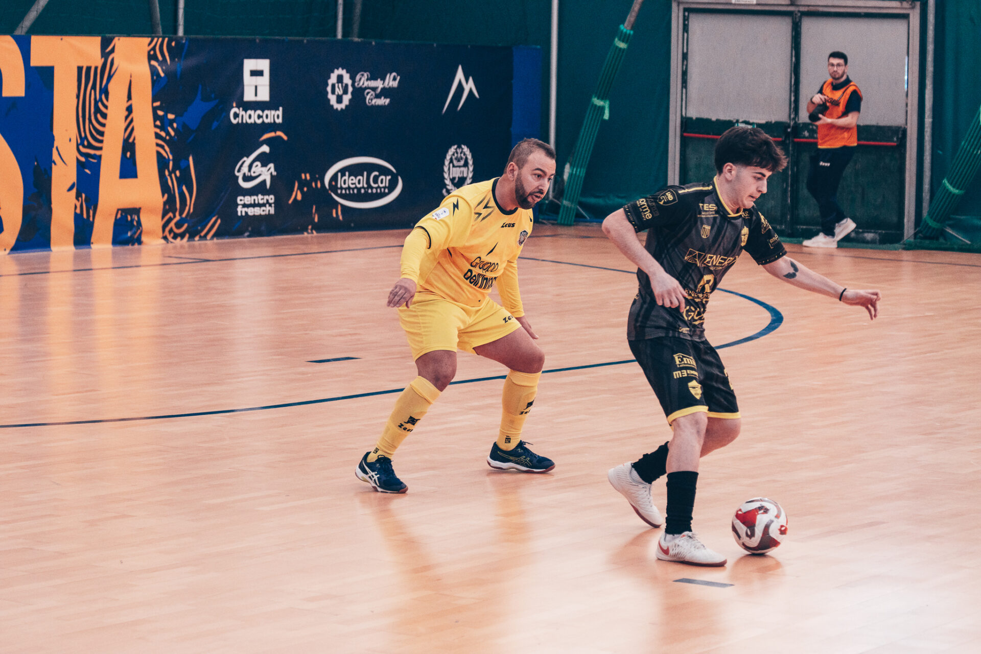 I gialloblù ripartono con determinazione nella ripresa, sfiorando il terzo goal con Menegatti, che di testa colpisce la traversa su un lungo rinvio di Rossero. I valdostani continuano a rendersi pericolosi, ma al 12’08” l’Energy Saving accorcia le distanze con Previtali.