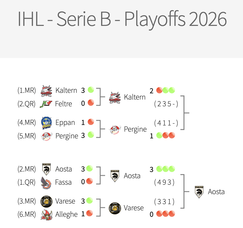 Nell’altra semifinale, il Caldaro si porta avanti nella serie contro il Pergine grazie a una netta vittoria per 5-1 in gara-3. I Lucci hanno indirizzato la partita già nel primo periodo e ora avranno il primo match point sabato: in caso di successo chiuderanno la serie e raggiungeranno l’Aosta in finale, mentre una vittoria del Pergine rimanderebbe tutto alla decisiva gara-5 in programma martedì 24.