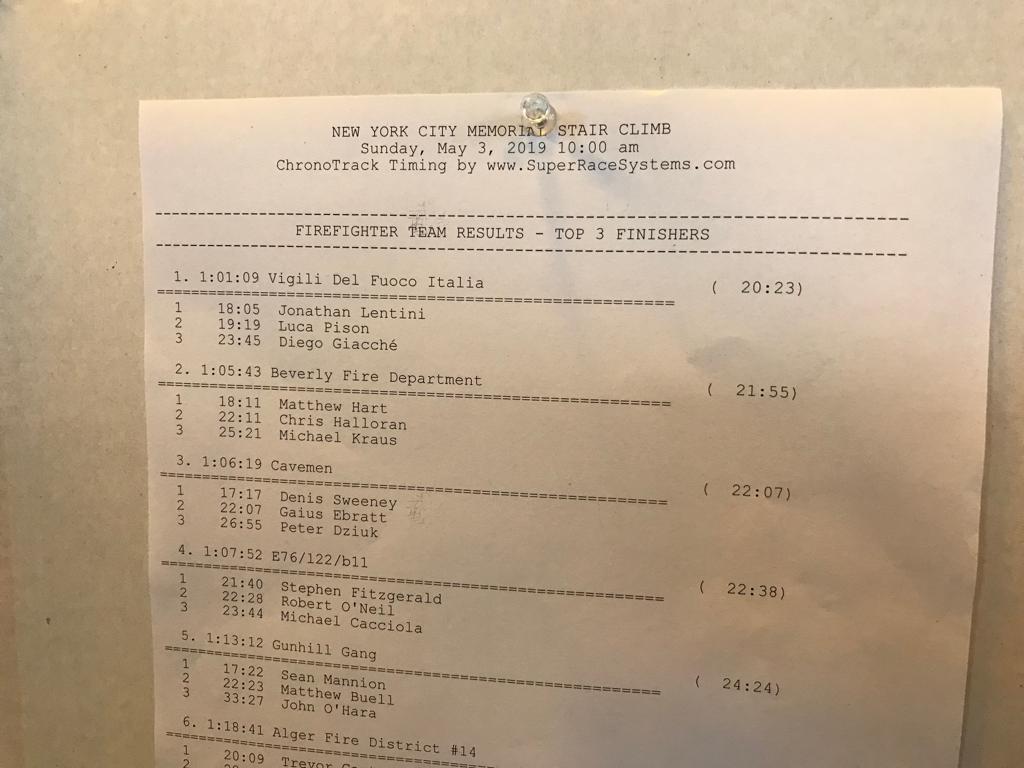 Un’ora, un minuto e nove secondi cumulativi per i primi tre Vigili del fuoco che ora guardano tutti dall’alto della classifica, grazie ai 18’ e 05” di Lentini (quarto assoluto in solitaria), i 19’ e 19” di Pison (sesto) e i 23’ e 45” di Giacché (43esimo), che hanno portato ad uno splendido 20′ e 23″ di media che li ha fatti schizzare in cima – e visto che siamo a New York è il proprio caso di dirlo – al mondo intero.