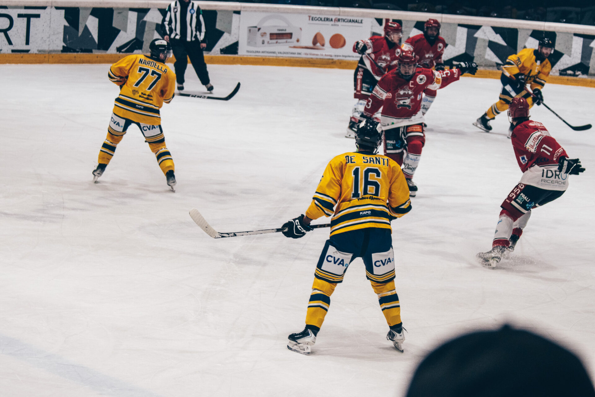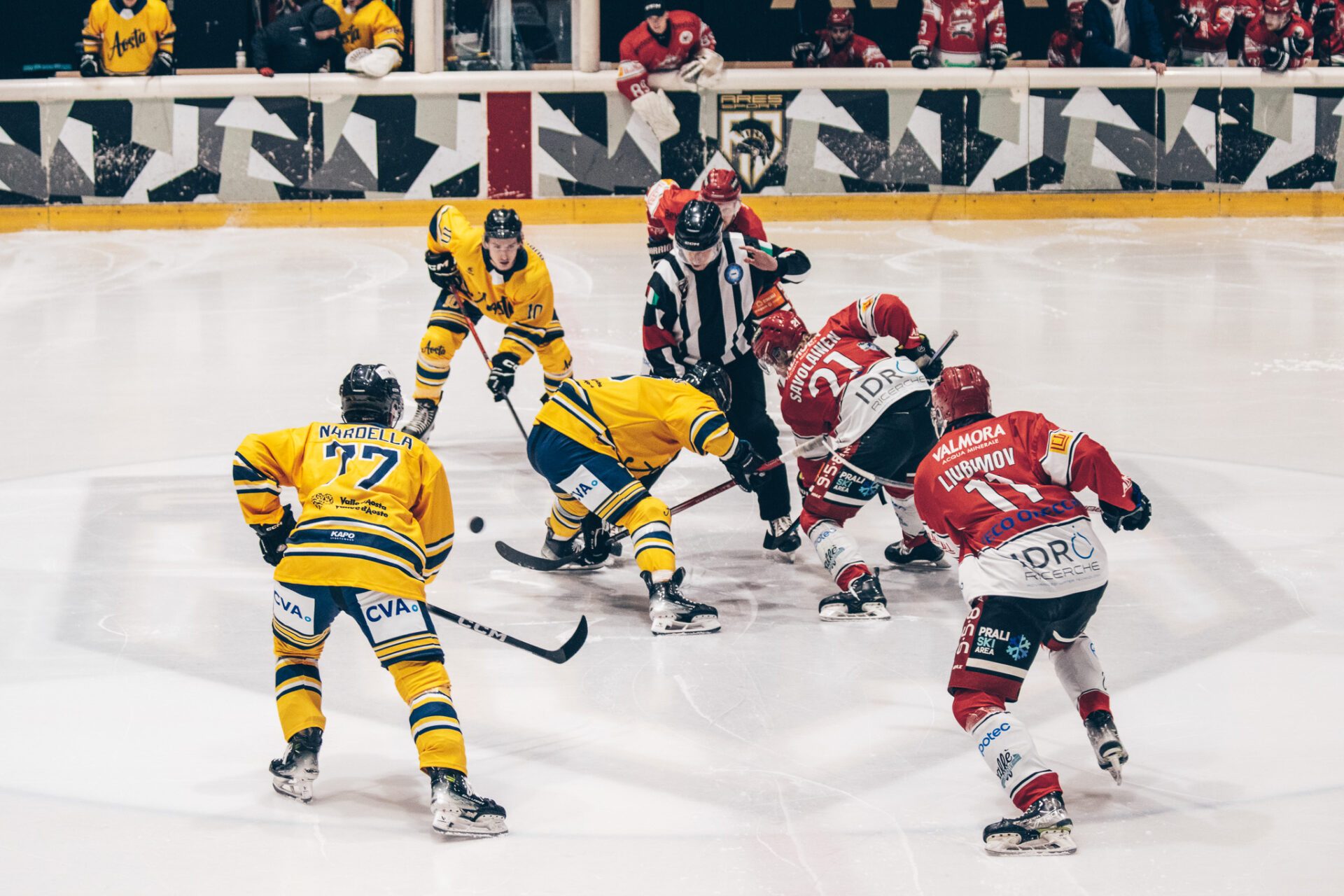 Il match si sblocca dopo appena 43 secondi con Nicholas Nardella che fa esplodere il pubblico di casa siglando la rete dell’1-0, con l’assist di Plouffe-dube e Fraschetta, cosi da mettere subito in chiaro l’atteggiamento dei valdostani. L’Aosta prende in mano il gioco e domina a lungo nella metà campo avversaria, ma all’ottavo minuto arriva il primo vero campanello d’allarme con una traversa piena del Valpellice, seguita poco dopo da un intervento decisivo di Perla su un tiro pericoloso degli ospiti. All’9’41” Nardella si prende nuovamente la scena con una splendida azione: servito da Lysenko e Nimenko supera la difesa avversaria e batte il portiere con un tiro imprendibile per il 2-0. Sul finale di primo periodo, però, il Valpellice accorcia le distanze e inizia a mettere pressione all’Aosta (2-1).