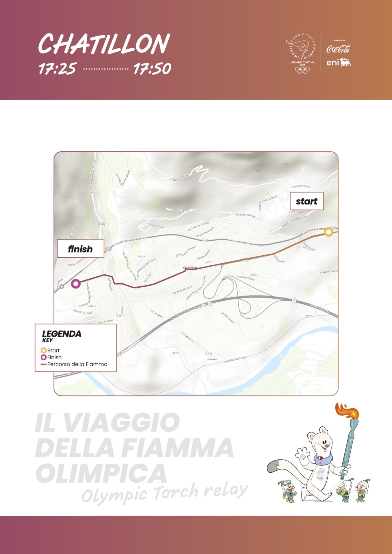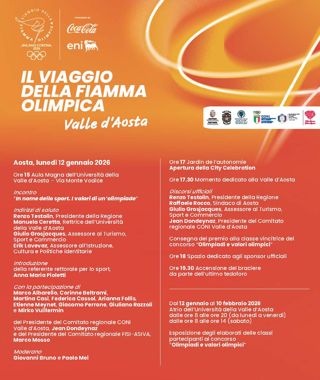 In occasione del viaggio della Fiamma Olimpica dei Giochi invernali Milano Cortina 2026, l’evento che segna l’arrivo in Italia delle Olimpiadi, la Fiamma stessa raggiungerà Aosta il 12 gennaio 2026 dopo aver percorso oltre 12mila chilometri, con la partenza da Olimpia, in Grecia.