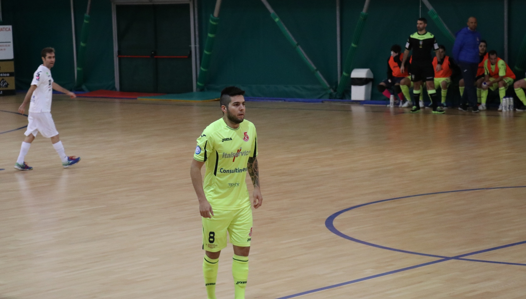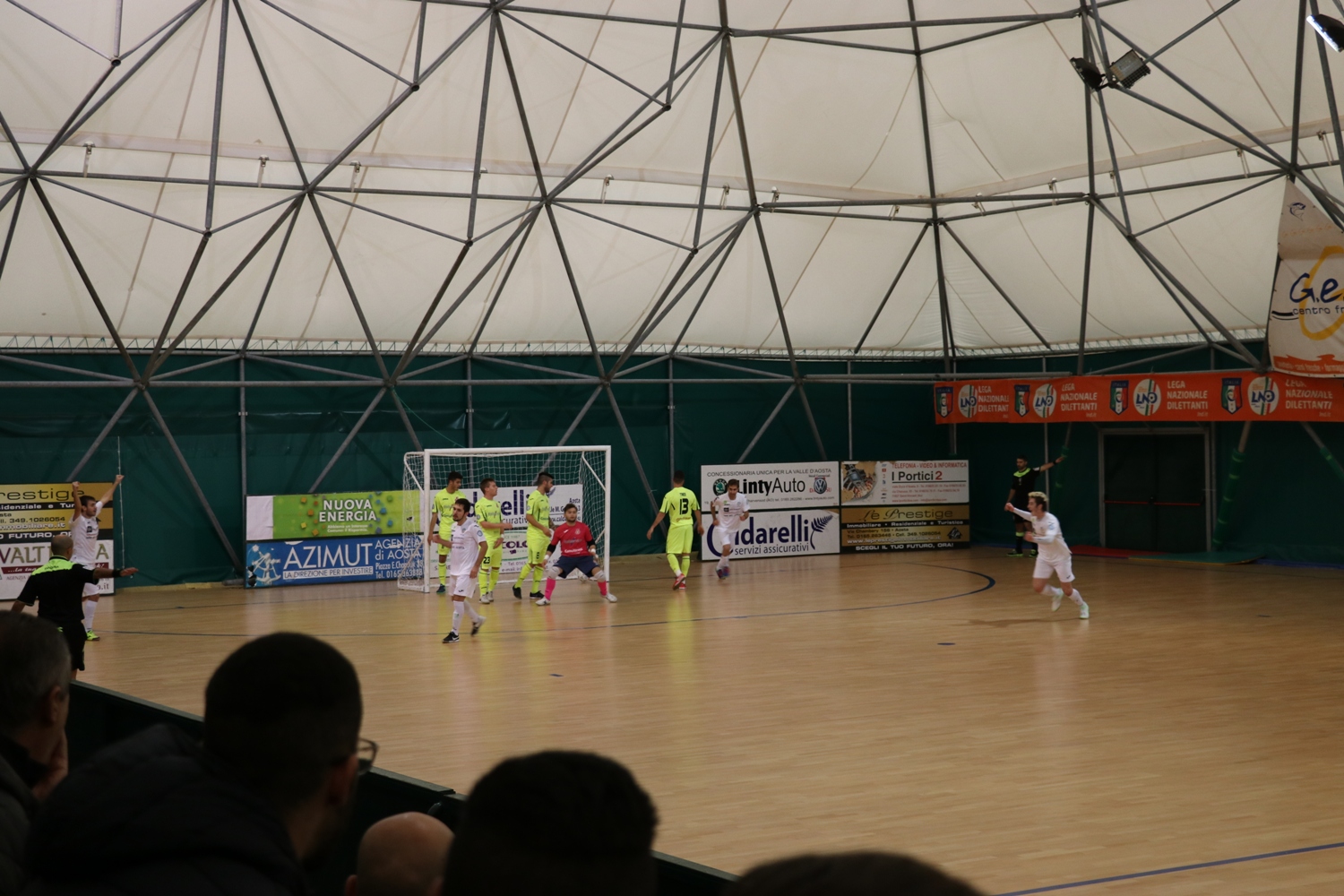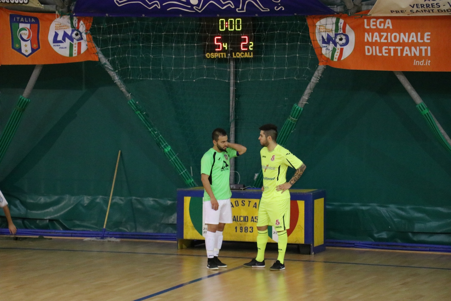 La partita inizia con un minuto di silenzio per ricordare la squadra brasiliana del Chapecoense, vittima di un tragico incidente aereo in Colombia lunedì 28 novembre. Rosa deve fare a meno di Estedadishad, squalificato, ma può contare su un pubblico numeroso, giunto a spingere i leoni gialloblù e a salutare Thomas Egea, ex di turno che ha giocato per quattro anni nell’Aosta. Nel 2014 passò all’Orte, dove vinse il campionato di serie A2, ma l’anno successivo la squadra fallì e fu retrocessa in serie B. Egea andò al Catanzaro e al Carmagnola, prima di finire al Pesarofano dove ha buone possibilità di vincere nuovamente il campionato di A2. I marchigiani, che hanno vinto fin qui otto partite su dieci, viaggiano a ritmi altissimi e hanno un buon gioco e, a parte l’autorete di Mirabelli dopo 55 secondi e un palo di De Oliveira un minuto dopo, l’Aosta è molto brava a tenere il ritmo e ad imbrigliare la manovra degli avversari. Al 10’ Birochi su punizione riesce a portare i suoi sul pareggio, e 30 secondi dopo Gennari è bravo ad impedire a Iurmanò di concludere a rete dopo essersi involato. La partita è vibrante e senza pause, con il Pesaro che va spesso al tiro su schemi da calcio piazzato, ma raramente trova la porta e, quando questo succede, trova anche un Luberto molto attento. Il Pesaro ha anche alcuni elementi molto bravi a saltare gli uomini e a servire i propri compagni, e nel giro di due minuti questa situazione frutta agli ospiti due reti, proprio nel momento migliore dell’Aosta. Al 14’40” Burato sulla destra salta di slancio due uomini e serve in area Hector, il cui tiro sporco beffa Luberto. Al 16’ azione fotocopia, con Stringari che salta un paio di uomini sempre sulla destra e serve in mezzo un pallone che sbatte su Lamedica e finisce in rete. Prova a rispondere Mirabelli con un tiro da fuori, ma è bravo Gennari a distendersi. A due minuti dalla fine Rosa indossa la maglia da portiere, anche se l’azione è lenta, quasi una melina per distrarre gli avversari. Si conclude senza altre emozioni un primo tempo che ha visto una buona Aosta, immeritatamente sotto di due reti. Nella ripresa, l’Aosta parte con Calli portiere di movimento, ma il Pesaro è bravo a chiudere tutti gli spazi e ad impedire l’imbucata. Al 2’30”, però, Sanchez riporta i suoi sotto con un bellissimo gol di testa – inconsueto per il calcio a 5 – su cross di Rosa. Due minuti dopo Gennari esce su Iurmanò lanciato a rete, la palla finisce a Mirabelli che tenta di beffarlo su pallonetto ma è bravo il portiere ospite a mettere in angolo con un colpo di reni. Tra il 7’ e l’8’ Luberto si prende la sua vetrina, con un intervento di piede e poi con una doppia parata, prima su un tiro dalla distanza sul quale era coperto e poi sulla ribattuta ravvicinata. Il giovane portiere ha però qualche responsabilità sul gol del 4-2 marchigiano, arrivato con un tiro dalla fascia sul primo palo da parte di Stringari. Calli e Iurmanò si alternano come portieri di movimento, ma Gennari non lascia passare niente, altrimenti ci pensa la traversa, come sul tiro di Sanchez deviato da un difensore al 12’30”. L’Aosta continua ad attaccare col portiere senza trovare fortuna, e protesta giustamente per un retropassaggio al portiere avversario non sanzionato dai direttori di gara. C’è tempo ancora per un sussulto quando Sanchez non riesce a trovare la deviazione su assist di Rosa di sinistro dalla linea di fondo sulla destra, nella sua classica azione. Il 5-2 finale arriva su tiro a porta vuota di Hector proprio sulla sirena.