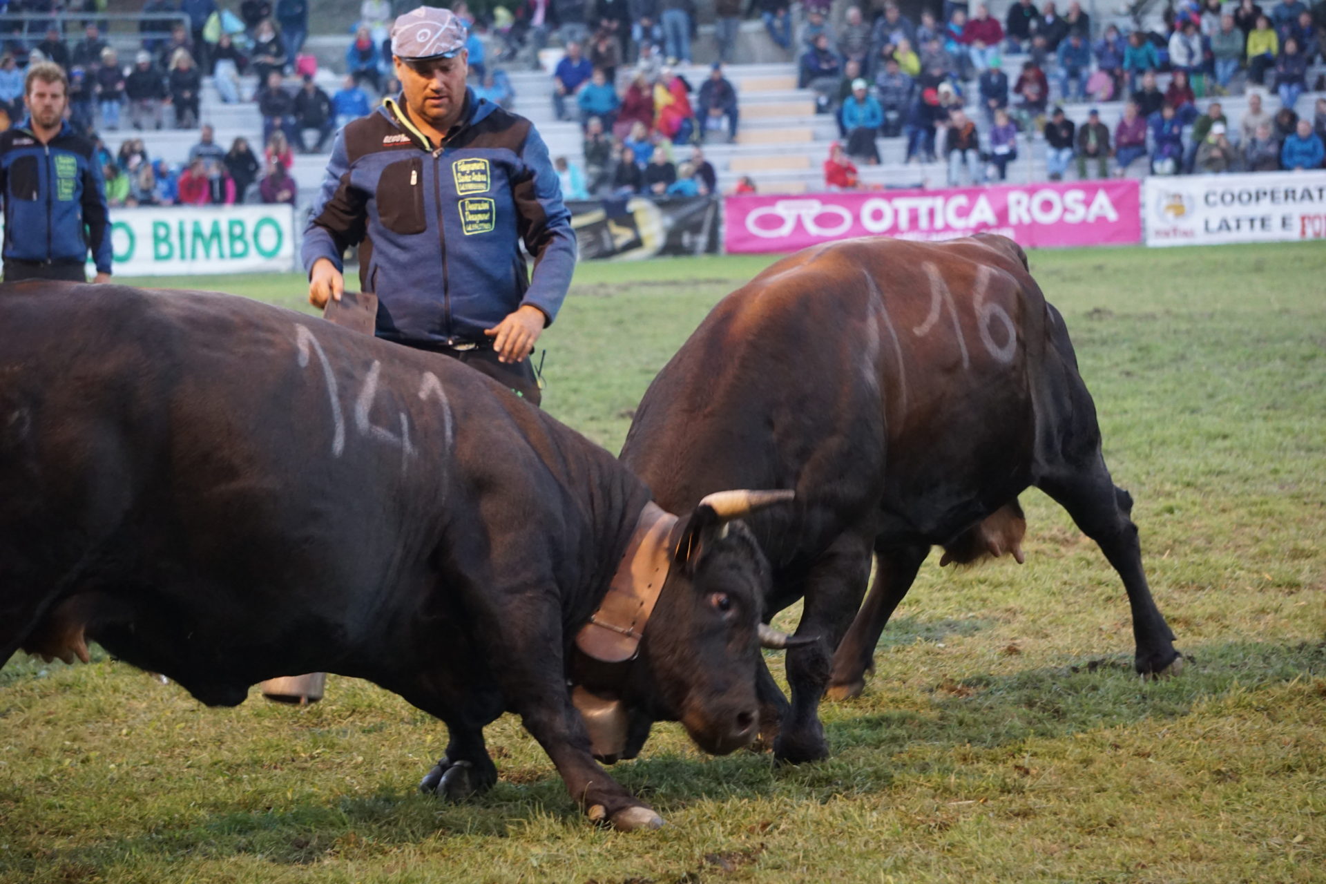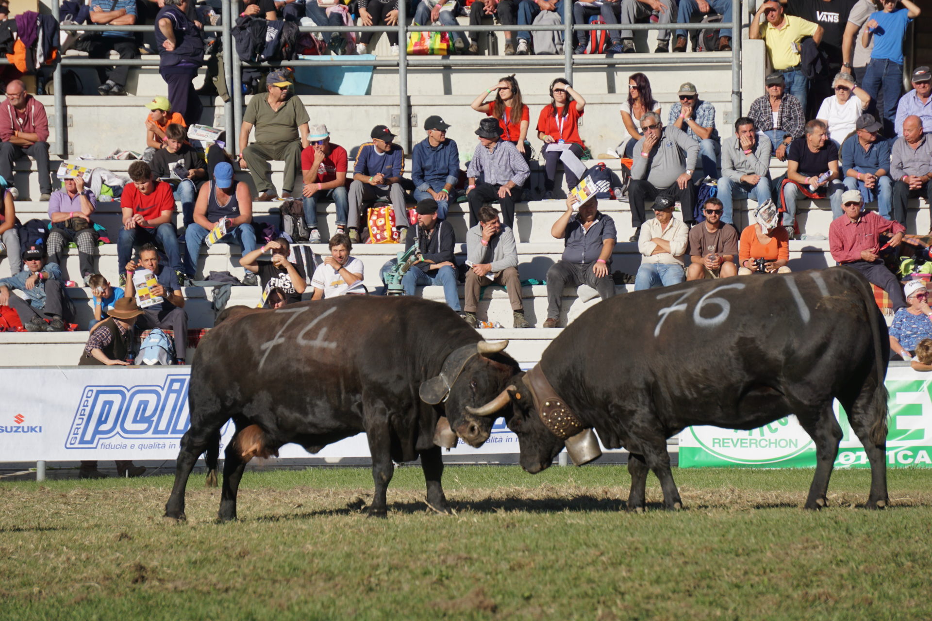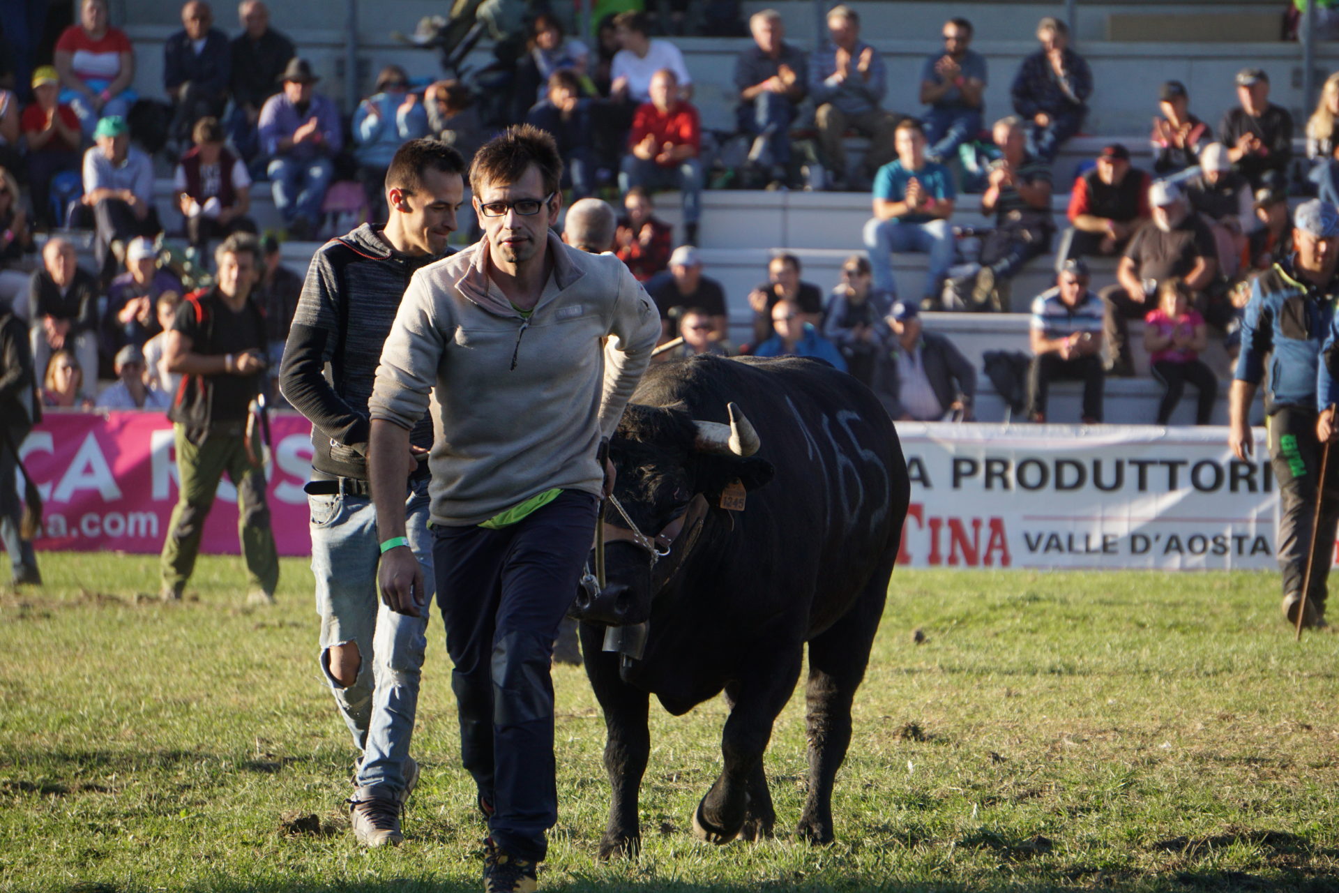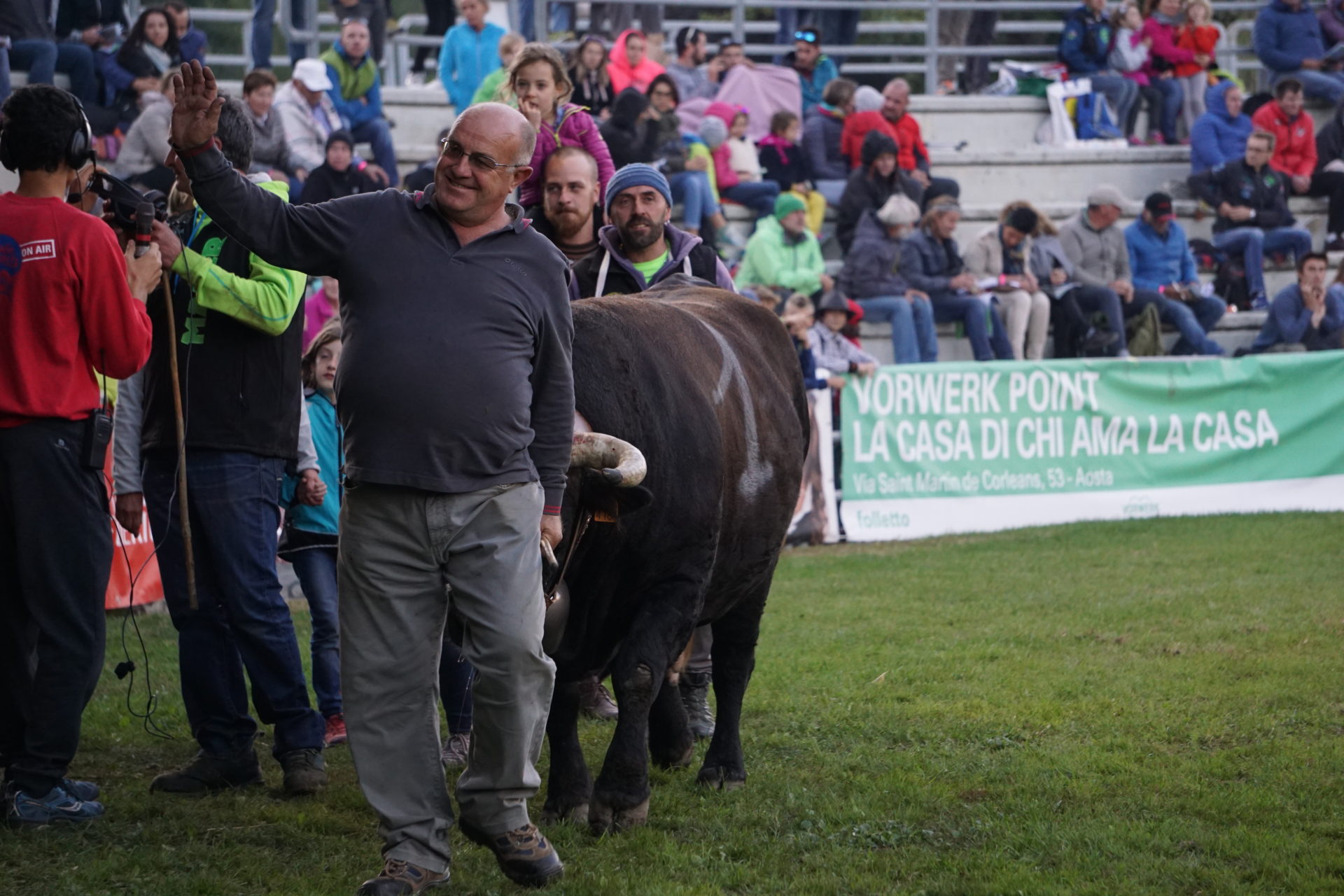 “Oggi porto a casa due carreaux, diciamo che per essere la mia prima regionale non potrei dire altro se non che sono emozionato e felice. Quasi senza parole. Non so se una situazione del genere mi ricapiterà, ma oggi me la godo”. Il giovane Alex Cerise di Fénis cerca di contenere la gioia che la sua Canaille è riuscita a regalargli battendo in un combat lampo Tiki della coppia di allevatori Chamonin-Frassy di Arvier. L’urlo liberatorio di Alex è quello della nuova generazione valdostana che da tempo si è affacciata al mondo delle Batailles des Reines e che si sta facendo strada a suon di vittorie e soddisfazioni. Il momento storico è importante, ora sono i figli degli storici allevatori a dare nuova linfa e entusiasmo al mondo dei combats. Alex è uno di questi giovani e la sua Canaille rispecchia a pieno la voglia, la fatica e il sudore di uno dei mestieri più duri e difficili del panorama valdostano. Il quarto di finale della neo-regina è rapido e indolore, tranne che per l’avversaria, l’ex reina 2017 Guerra di Gildo Bonin di Gressan. La magia di una vecchia regina che affronta una novella viene spenta dall’infortunio che Guerra subisce subito, alle prime battute, quando il suo corno si sfila e l’allevatore, avvertito il problema, decide di portarla via.