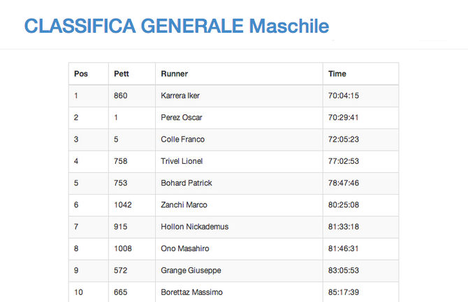 Franco Collé è arrivato alle 10.22, frastornato per aver appreso a pochi metri dell’arrivo della morte dell’atleta cinese. Fra le donne si è ripresa la prima posizione Francesca Canepa, dodicesima assoluta, passata a Cuney alle 5.36 e attesa ad Oyace, seconda la spagnola Nerea Martinez a pochi minuti di distacco (a Cuney alle 6.01). Terza, 30esima in assoluto Emanuela Tonetti.