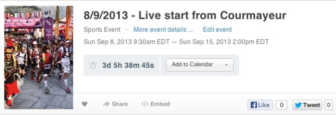 Il primo appuntamento programmato nel palinsesto della Web Tv è la partenza della corsa, in calendario domenica 8 settembre 2013. Il collegamento da Piazza Brocherel a Courmayeur sarà attivo dalle 9.30, con interviste, curiosità e servizi sulla consegna dei pettorali del giorno precedente. Una volta iniziata la gara, la troupe seguirà la testa della corsa, fornendo due aggiornamenti quotidiani – alle ore 11 e alle ore 18 – dalle basi vita. Mercoledì 11 settembre furgone, regia e telecamere rientreranno a Courmayeur per seguire in diretta l’arrivo dei primi. Da giovedì 12 a sabato 14 settembre l’appuntamento con la web tv sarà uno solo, alle ore 18, con il riassunto degli arrivi giornalieri, fino a quando anche l’ultimo atleta avrà tagliato il traguardo. Gran finale in diretta domenica 15 settembre con la premiazione al Jardin de l’Ange di Courmayeur.