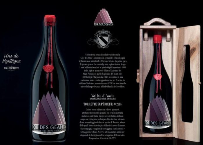 Trecentotrenta Magnum di Torrette Superieur, rosso valdostano prodotto dalla Cave des Onze Communes, saranno numerate e messe in vendita con la speciale etichetta Tor des Géants. Trecentotrenta esemplari numerati, tanti quanti sono i chilometri di gara (tre litri a bottiglia, 125€ l’una), prodotte solo quest’anno e presentate in una confezione in legno realizzata a mano da uno scultore valdostano.