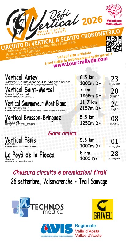 Grande novità per il Défi Vertical è il passaggio del Vertical Fénis del 1° maggio a gara amica, passato nel calendario delle martze a pià, da cui invece arriva l’altra gara amica, la Poyà de la Fiocca di Avise del 28 giugno da 8 km con 1000 metri di dislivello. Il campionato partirà invece il 23 maggio con il Vertical Antey, seguito dal Vertical Saint-Marcel del 20 giugno e dal VK2 del Vertical Courmayeur Mont Blanc del 24 luglio. Ultima gara del circuito il Vertical Brusson-Bringuez, in programma l’8 agosto.