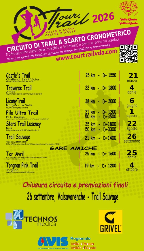 Il Tour Trail parte come da tradizione dal Castle’s Trail da 25 km con 1550 m D+, che quest’anno avrà come sede Challand-Saint-Victor e che è stato anticipato al 21 marzo per evitare sovrapposizioni con il carnevale. Si rimane in bassa Valle con il Traverse Trail di Arnad (22 km e 1800 m D+) il 4 aprile, per poi spostarsi, il 6 giugno, in Valdigne con il Licony Trail da 28 km e 2000 metri di dislivello. Dopo l’annullamento dell’anno scorso torna il Pila Ultra Trail (1° agosto) con due distanze, una 21 km con 1200 m D+ e una 50 km con 3500 D+. Due distanze anche per la seconda edizione dello Stars Trail Luseney del 22 agosto (25 km e 1800 m D+ e 50 km con 3300 m D+), prima del gran finale di Valsavarenche da 21 km e 1400 m D+. Come d’abitudine il Tor Avril del 25 aprile sarà gara amica, al pari del Torgnon Pink Trail da 19 km con 1200 m D+ del 4 ottobre.