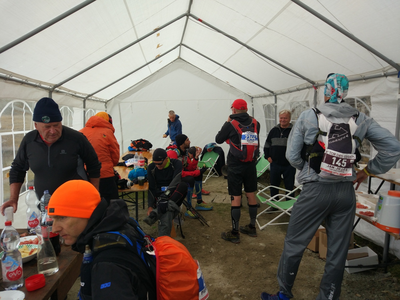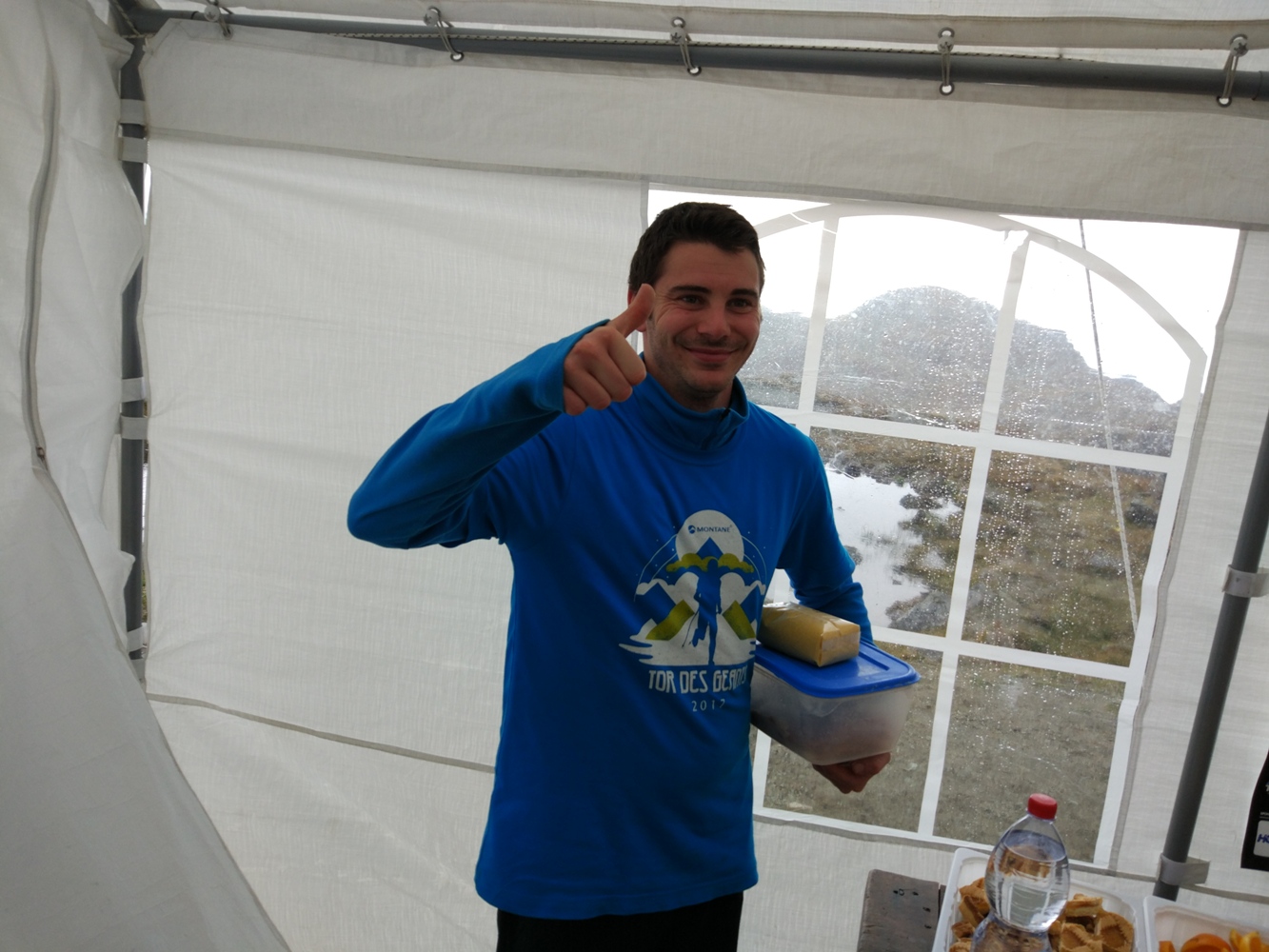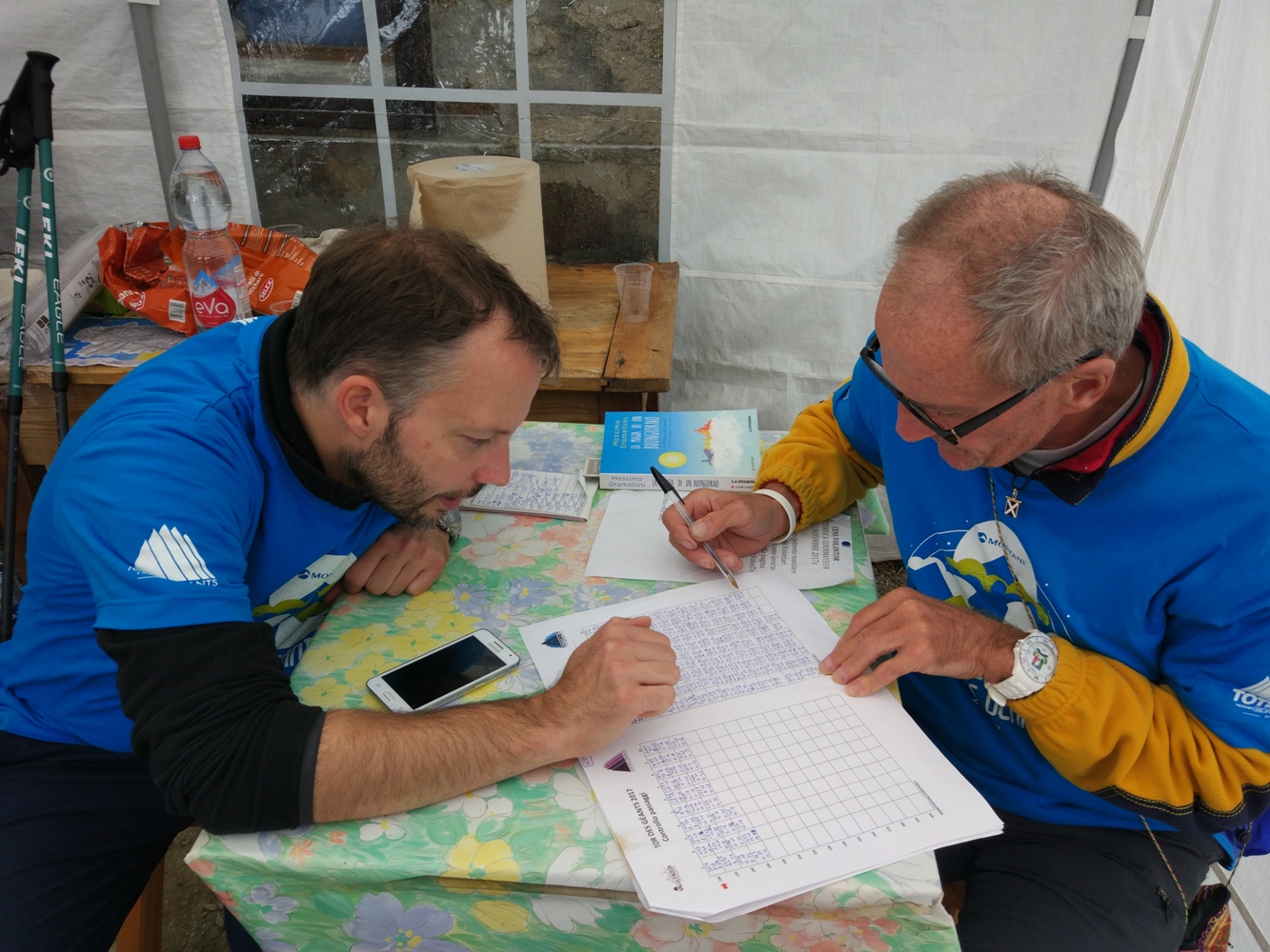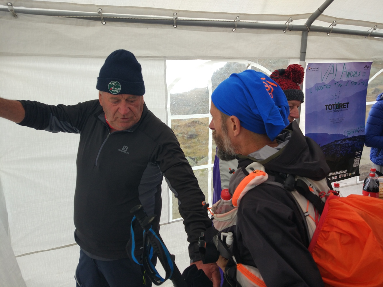 A coordinare tutte le squadre è Erika Noro, che da sempre gestisce con grande maestria basi e VolonTor. Il passaggio successivo è il contatto con Camillo Rosset, Vicesindaco e Assessore al Turismo, Sport e Commercio del Comune di Nus: “L’Assessore comunale è il responsabile di ogni sede presente sul proprio territorio di competenza”, spiega. “Nel caso di Nus, bisogna gestire sia il Rifugio Cuney che il Rifugio Magià. Questo è il terzo anno che lo faccio, ma le squadre sono già collaudate molto bene. Certo, a volte bisogna far fronte ad alcune défaillances dell’ultim’ora e non è facile, ma lo spirito di sacrificio di questi volontari è grandioso”. Rosset racconta di qualche imbarazzo l’anno scorso, con il 4K, ma ammette che, in fondo, “il valdostano è buono e non si fa problemi”. Lasciata la macchina a Fontaney, ci incamminiamo verso il Cuney, e nel percorso Rosset, estasiato ed innamorato della propria vallata, racconta: “Quando c’era il Bivacco Reboulaz era bellissimo: un posto molto raccolto, dove bisognava portare a mano il generatore, ma con un’atmosfera stupenda”. Incrociamo ed incitiamo molti trailers, fronteggiando un tempo da lupi che, inizialmente, ci aveva illusi. Abbandono momentaneamente Rosset ed il collega Fabio per evitare una ferrata che, già solo vista da centinaia di metri di distanza, mi fa venire le vertigini, e ci rincontriamo al rifugio. Della trentina di persone che Rosset coordina, tra Cuney e Magià, in questo momento nel tendone ce ne sono 6, oltre a qualche atleta. Tutti sono dei monumenti dei VolonTor, e sono qui praticamente da sempre. Ad accogliere e salutare i corridori sulla soglia ci sono Venanzio e Lorenzo. Quest’ultimo è qui dal primo anno, ma ha dovuto saltarne due. È coraggioso, Lorenzo, ha quello spirito di sacrificio tipico degli alpini, ed è uno di quelli che fanno il doppio turno: e ogni turno è di 24 ore. “Un ragazzo di Milano che sta facendo il Tor mi ha detto che, se arriva a Courmayeur, l’anno prossimo viene a fare il volontario. Mi sono fatto lasciare il numero, ci conto”, racconta. “Ognuno dà una mano come può: c’è chi sta all’entrata, chi tiene i tempi, chi si occupa dei rifornimenti. Siamo tutti utili, cerchiamo anche di dare sostegno a chi corre”. Venanzio ha partecipato a tutte le edizioni, anche se “gli anni iniziano a pesare”. Al tavolo del rilevamento cronometrico ci sono Stefano e Italo: Stefano scansiona con il cellulare i braccialetti di tutti, mentre Italo scrive a mano sul registro gli orari di entrata e di uscita per ogni pettorale. C’è anche un altro bloc-notes: “Qui segniamo a che ora ogni atleta vuole essere svegliato”, spiega Stefano. “C’è il numero del pettorale ed il numero del letto. Se non li svegli all’orario giusto si arrabbiano molto”. “Anche quando li svegli si arrabbiano, a volte”, ironizza Lorenzo. Stefano c’è da sempre, mentre Italo ha saltato il primo anno: “Speravo di farlo da atleta, perché sono uno che fa sport. Sono molto legato a Cuney, credo che sia un posto magico”. Italo è schivo, non gli piace apparire, però ogni anno viene qui, da Cuorgné, e vuole fare il doppio turno. Dormono due, tre ore al giorno, ma sono sempre sorridenti e in forma, e non perdono occasione di scherzare. “Siamo un team affiatato, ormai ognuno ha le proprie mansioni: squadra che vince non si cambia!”. I volontari non sono soli. Ad affiancarli, trasformandosi a loro volta in VolonTor, ci sono i gestori del rifugio: “Diamo loro da mangiare, ci occupiamo di tenere i viveri sempre ben riforniti. Anche noi facciamo turni, dormendo un paio d’ore: anche noi facciamo il nostro Tor!”, spiegano. “Perché questa maglietta bisogna guadagnarsela”. Già, la maglietta: il vero premio di ogni VolonTor è la t-shirt, prestigioso segno di riconoscimento dello sforzo fatto, vessillo da conquistare con sacrificio ed esibire con grande orgoglio.