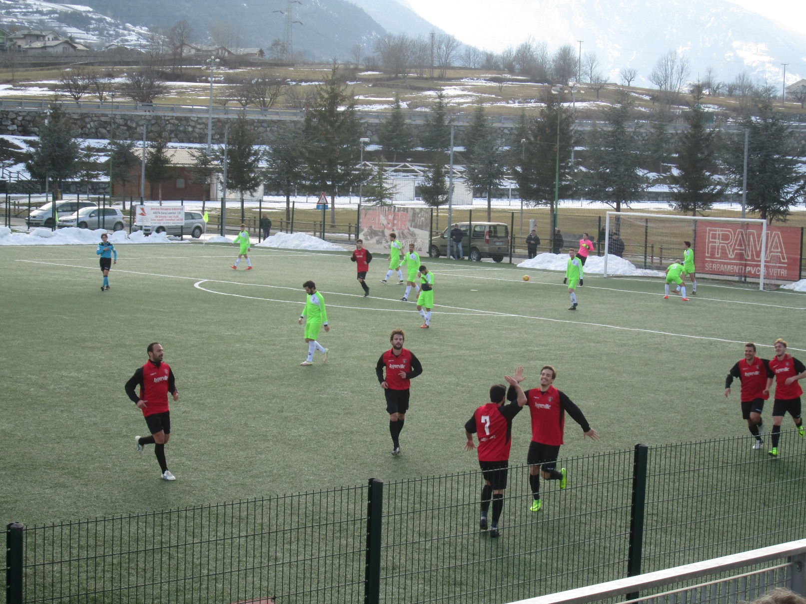 La prima azione è per i padroni di casa, che al 5’ prima creano un’occasione con Turato, il cui tiro viene murato da un difensore dopo il cross di Marchesano, e poi con Pramotton, che calcia alto dal limite dell’area. Qualche minuto dopo è Cunéaz ad intercettare un rilancio degli avversari e tentare il tiro da posizione defilata, ma Cerruti para senza troppi problemi. Al 12’, è sempre il numero 7 rossonero a costruire, con un cross pennellato per la testa di Noro che viene anticipato di un soffio. La partita è molto spezzettata per via di una direzione di gara un po’ troppo fiscale, che fischia molti falli ai padroni di casa e non permette che il gioco si sviluppi con continuità. Al 16’ si fa vedere l’Orizzonti, con un’azione ben confezionata conclusa con il tiro di Gilio in fallo laterale. Sono ancora gli ospiti a rendersi pericolosi in due occasioni, prima con Gilio che salta da solo in area ma non riesce a centrare la porta con il colpo di testa, e poi con una punizione insidiosa di Giunta, non deviata da nessuno che stava per beffare Gini, reattivo. Al 29’ i padroni di casa trovano la via del gol con Cunéaz che, dal vertice dell’area, lascia partire un tiro-cross di sinistro rasoterra a rientrare, su cui non arriva Noro ma che va a depositarsi in fondo alla rete. Sul finire del primo tempo c’è ancora spazio per un ottimo intervento di Gini a salvare il risultato su azione confusa in area. L’Aygreville si affida molto ai lanci lunghi e non riesce a costruire la propria manovra con fluidità, soccombendo alla fisicità dei piemontesi che, nella ripresa, schiacciano i padroni di casa nella propria tre quarti di campo. Nonostante questo, però, è l’Aygreville ad avere le occasioni da rete più nitide, affidandosi alle ripartenze grazie alla coppia di centrali Rega-Prola molto attenta a chiudere gli spazi agli attaccanti avversari. Al 15’ Cunéaz va vicinissimo al raddoppio, dopo aver saltato con un tocco morbido il portiere, ma viene fermato da un difensore sulla linea di porta, con Thomain anticipato di un soffio sulla ribattuta. Attorno al ventesimo in luce entrambi i portieri: prima Gini blocca un colpo di testa di Amedeo da buona posizione, poi Cerruti salva su un’azione caparbia di Noro. Verso la mezz’ora, le due occasioni che potrebbero chiudere l’incontro passano dai piedi di Thomain, che però non ha la lucidità necessaria: prima sbaglia un appoggio per Cunéaz, che si sarebbe trovato davanti al portiere e poi, a tu per tu con l’estremo difensore avversario, lo salta sulla sinistra ma si allarga troppo e non riesce a trovare la porta vuota. Un’occasione d’oro che peserà sulle sorti dell’incontro, perché proprio allo scadere, dopo un forcing insistente dell’Orizzonti, è Pititto a trovare la rete del pareggio. In quest’occasione, Mazzei si fa espellere per proteste.