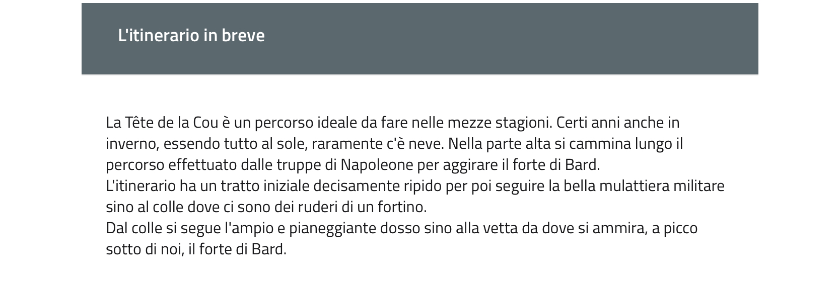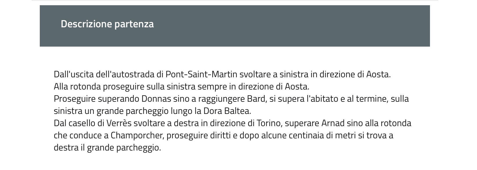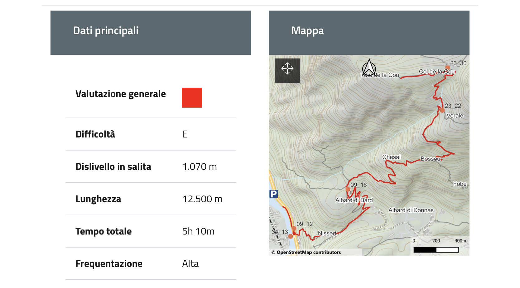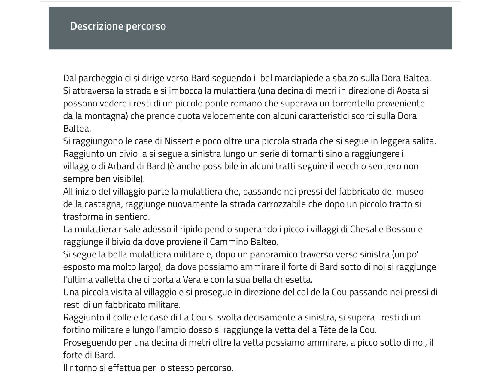 Ciascun percorso inserito nel portale Monterosa outdoor è completato da una scheda propria riportante dati utili circa il patrimonio ambientale, archeologico, architettonico, artigianale, museale e storico che possiede; è inoltre prevista una sezione che concerne i servizi principali tra ricettività, ristorazione e sport che esso offre, ognuno completo di indirizzo telefono, sito web, email, resoconto scritto e coordinate geografiche.