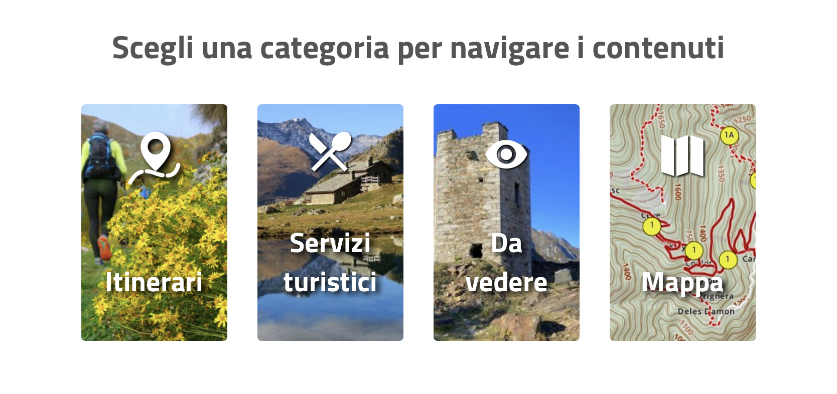 Agli occhi dell’utente il sito web Monterosa outdoor si presenta anzitutto la scelta tra le 4 icone che rimandano a “Itinerari”, “Servizi turistici”, “Da vedere” e “Mappa”, quest’ultima risultato di una cartografia personalizzata a partire da dati open source. Scorrendo verso il basso, un apposito algoritmo suggerisce sulla base del mese corrente altre 4 tipologie di attività che ben si prestano a stagionalità e condizioni dei sentieri.