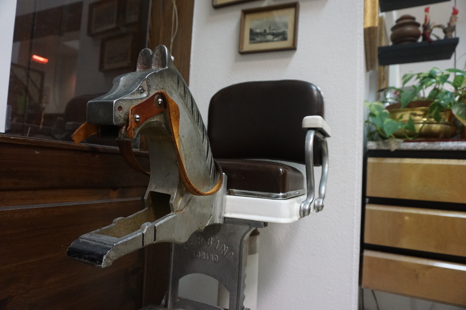 Accanto a Marino, appoggiato allo schienale di una delle due poltroncine, il cavallino degli anni ’30, sedile pensato per i bambini, su cui generazioni di piccoli futuri barbuti venivano fatti sedere aspettando il turno del padre o per un taglio rapido, ma Marino ci teneva a precisare: “Avevo iniziato a fare qualche taglio sul cavallo, poi però i bambini erano troppo distratti, si muovevano in maniera scattante e io in mente ho sempre avuto una cosa: la sicurezza. Se non posso lavorare in sicurezza le forbici in mano nemmeno le prendo, ma ti assicuro che se avessi avuto una moneta per ogni foto di bimbo in sella a quest’ora avrei una fortuna”.