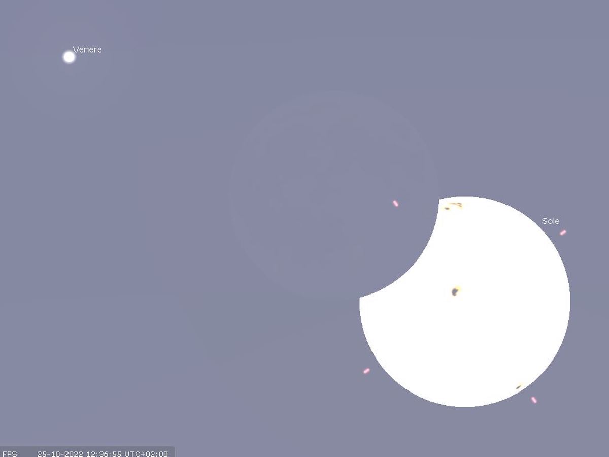 Aspetto della fase massima dell’eclisse solare parziale del 25 ottobre alle 12.15 ad Aosta (a sinistra) e alle 12.35 ad Agrigento (a destra). Si noti la diversa distanza apparente del pianeta Venere dal Sole e dalla Luna. Elaborazione con il software Stellarium (http://stellarium.org )