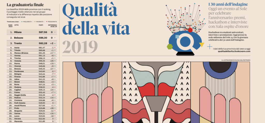 Aosta perde una posizione rispetto al 2018, finendo quarta. L’indagine del Sole 24 Ore prende in esame 90 fattori, divisi in sei macro aree tematiche che indagano altrettante componenti dello star bene. Aosta è prima in “Ricchezza e consumi”.